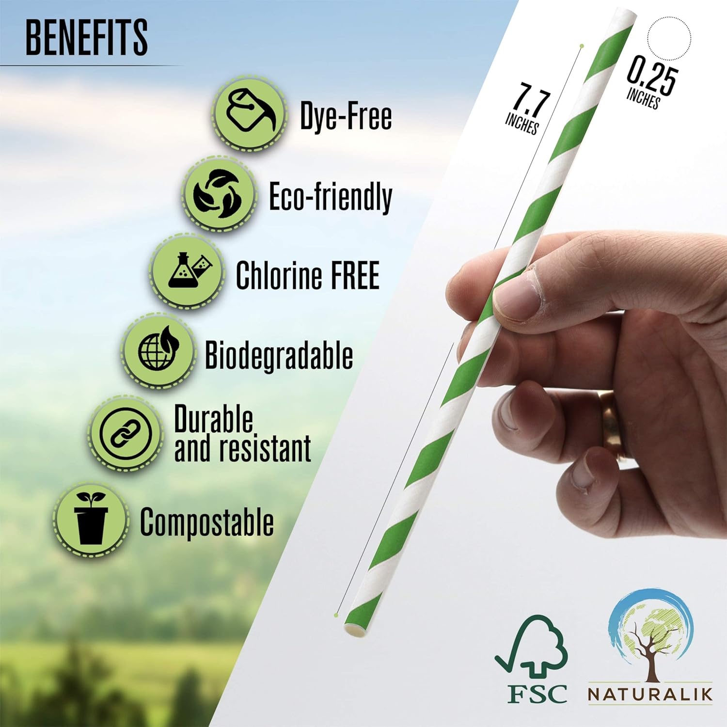 - NATURALIK 300pc Premium Multi-Color Paper Straws are made of extra durable materials that make them very sturdy and long lasting. They are toxin free, taste and odor free. The dimensions are 7.75" long.0.25" diameter. There are 10 colors included in each pack, 100pc of each color: Light Pink, Bright Pink, Light Blue, Navy Blue, Yellow paper, Orange, Purple, Lime, Green and Red paper straws.