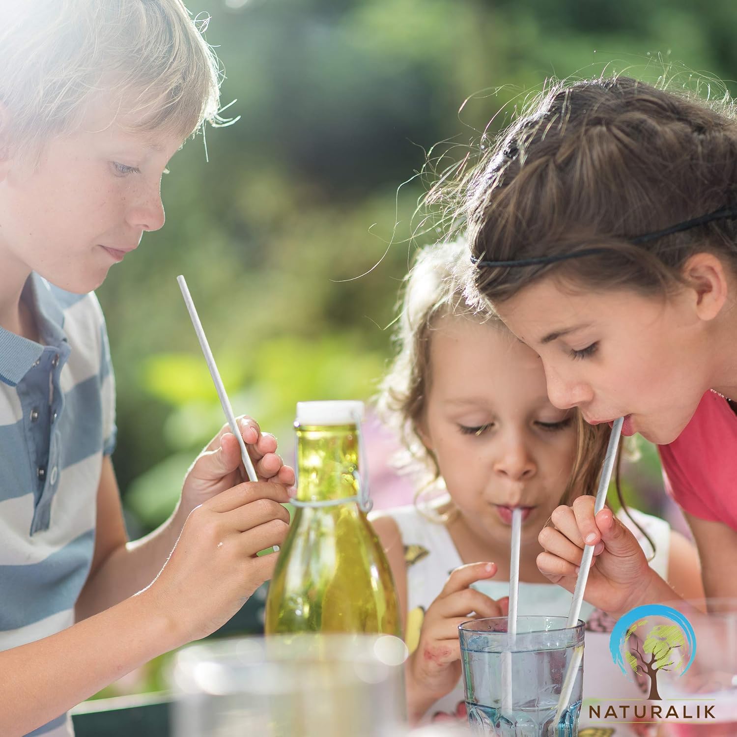 - NATURALIK 300pc Premium White paper straws made with 1/3 more material than regular paper straws which makes them extra durable and sturdier. They are dye-free, toxin free, taste and odor free. 7.75" long, 0.25" diameter. Bulk Paper Straws for Juices, Smoothies, Party Decorations and Restaurants. Also available in bulk packs of 1000pc. Search B07NTLGWDB on Amazon.com