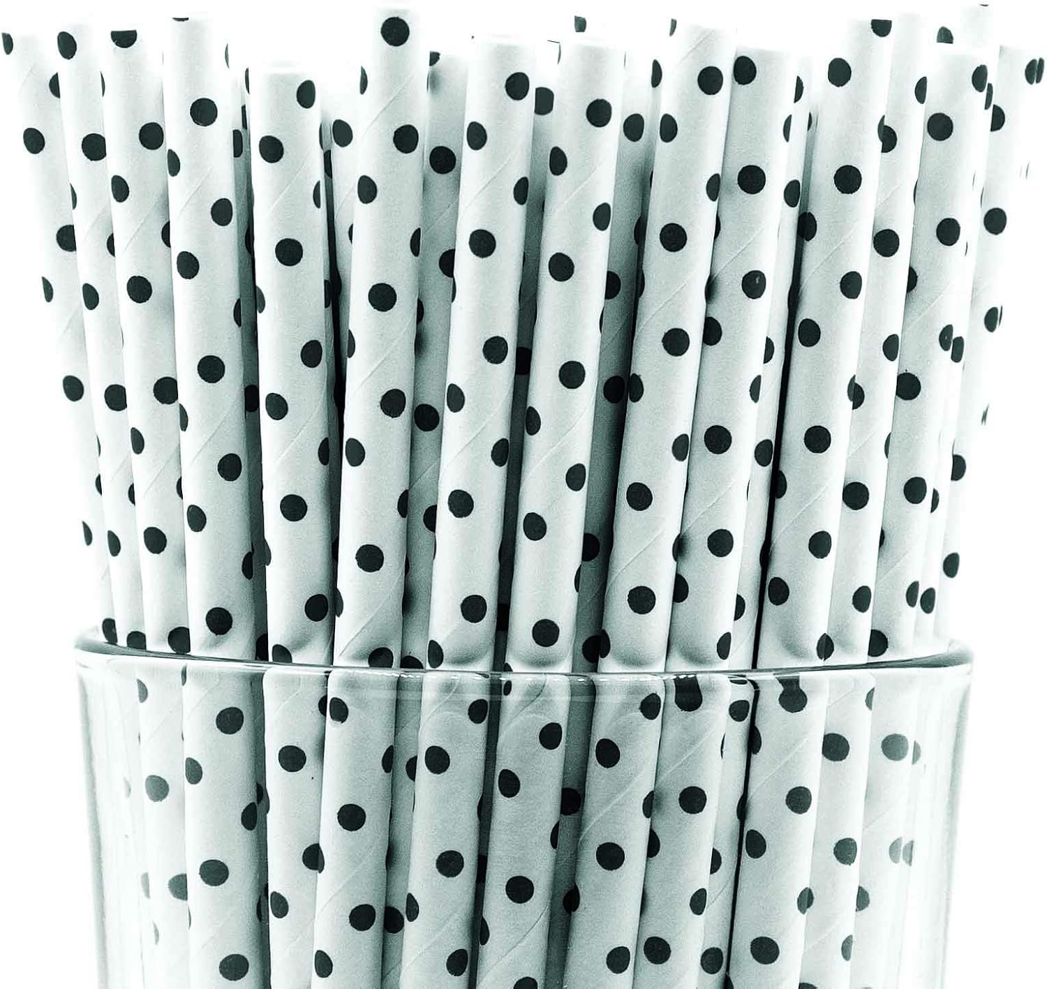 - Pack of 150 Black Polka Dot paper straws that are 7.75” long and have a diameter of 0.25”. Made with 4-ply paper which translates into thicker and more resilient straws that won’t wilt or change shape in both hot and cold drinks.
