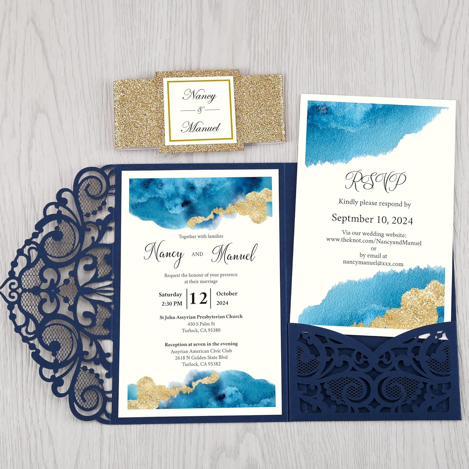 - Wedding invitation kit included: 100 personalized wedding invitation inner sheets, 50 wedding invitation pockets, 50 gold glitter belly bands,50 printed tags, 50 gold glitter small backer for the tag,50 envelopes, 50 seals.