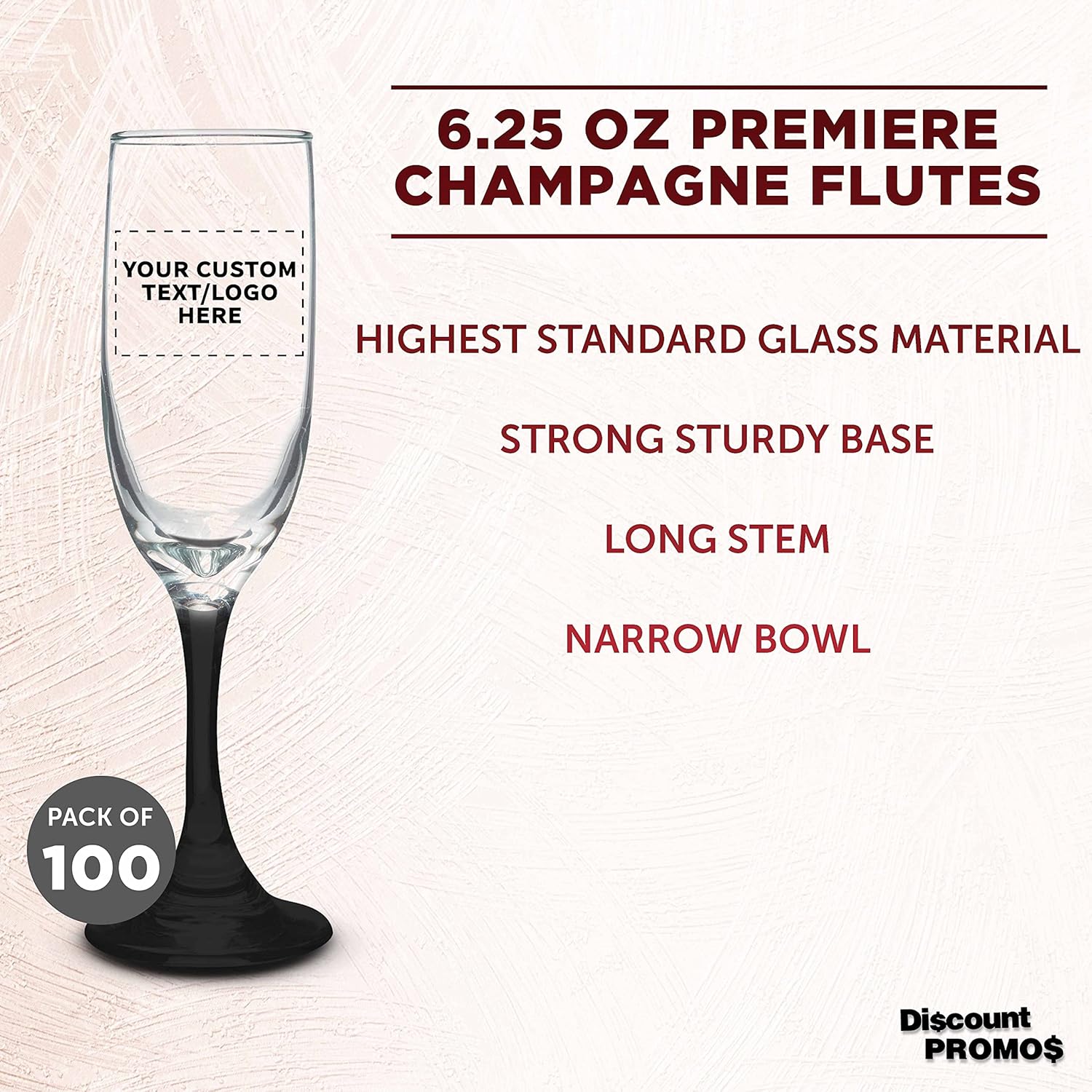 DISCOUNT PROMOS Custom Premiere Champagne Flutes 6.25 oz. Set of 100, Personalized Bulk Pack - Elegant Drinkware for Weddings, Events, & Promotional Gifts - Black
