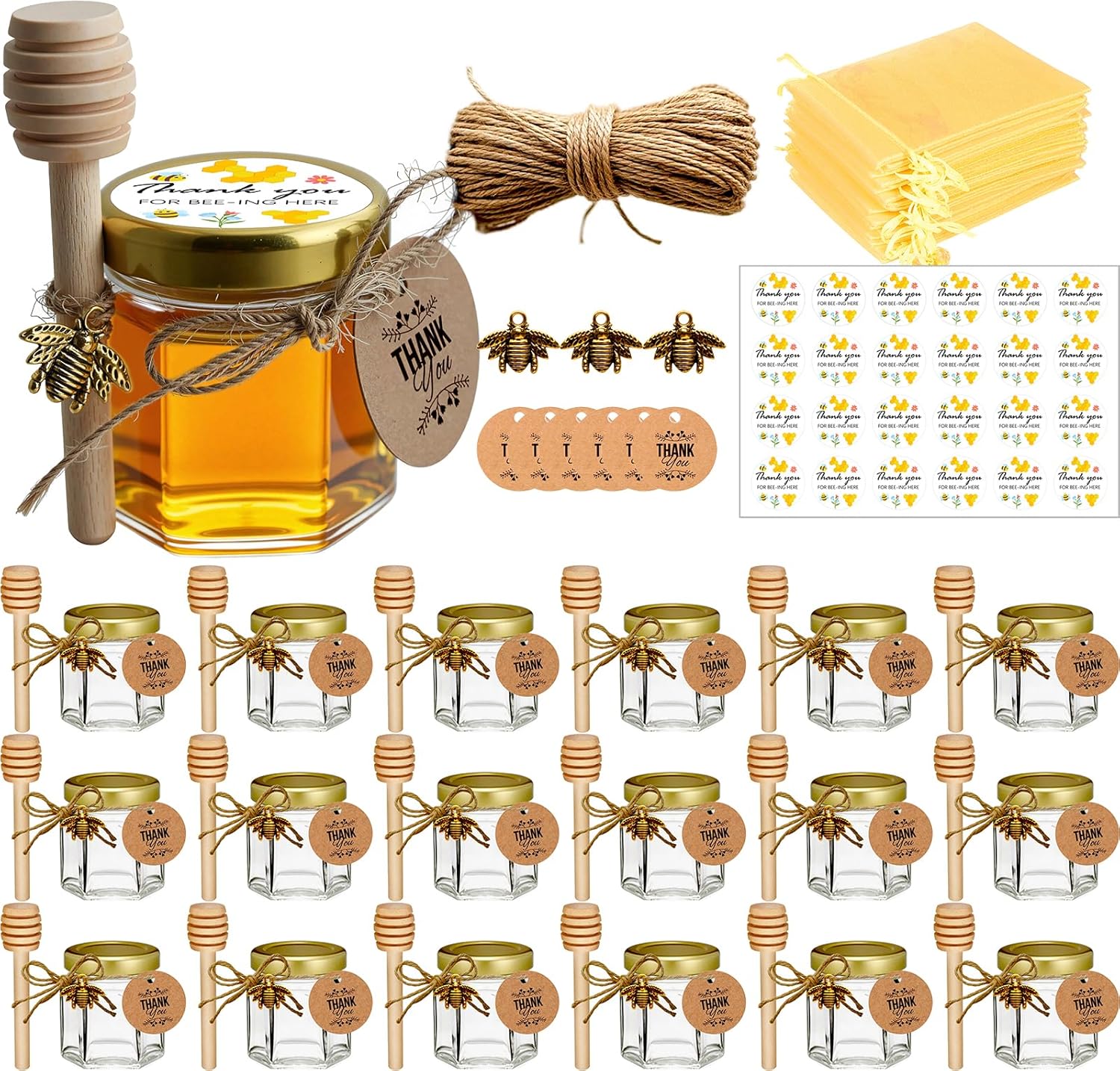- What You Will Get - Our 1.5oz glass honey pot is come with Bee-Themed Accessories, including 20 pcs glass honey jars and wood dippers, 20 pcs gold lids, 12m jutes, 20 pcs bee charms, 20 pcs gold gift bags and 20 pcs thank-you tags