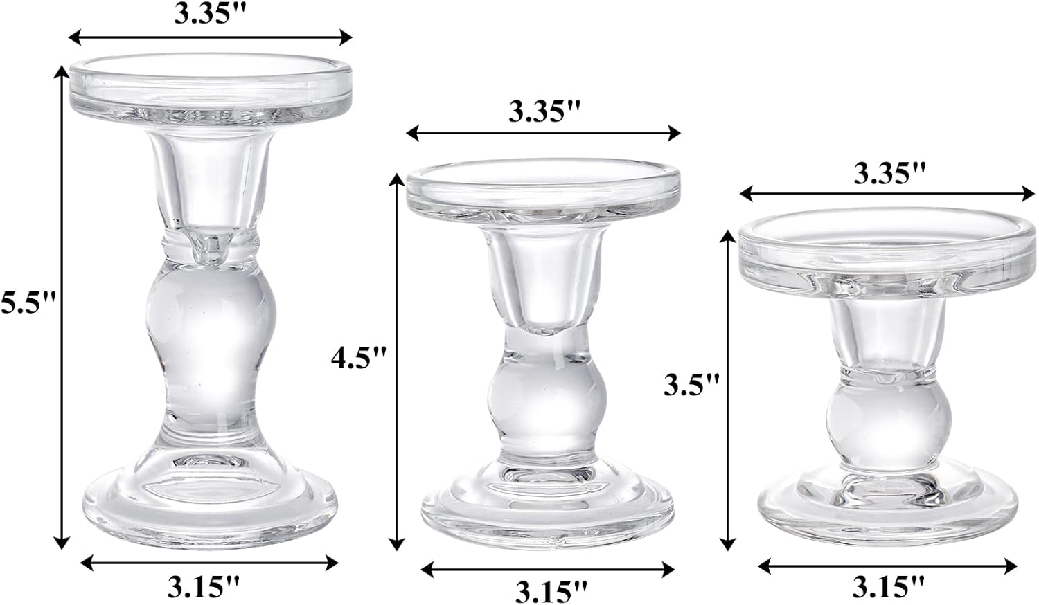 - Our set of 6 glass candle holder set comes in 3 different sizes. Each candlestick holder measures 3.15" D/8cm of the base, 3.35"/8.5cm D of the plate , and 3.5"(8.6cm) / 4.5"(11.5cm)/ 5.5"(13.8cm) H separately, which perfectly meets you different needs for home decoration.