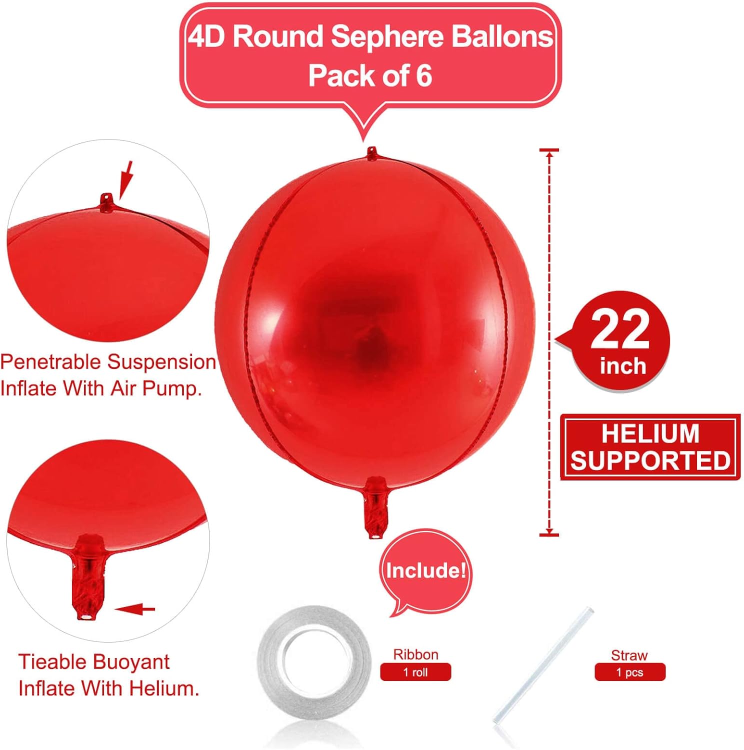 - Large Size Foil Balloons: 6 Pcs 22 inch 4D Round Foil Balloons (uninflated) + 1pcs Straw +1pcs 32 foot Ribbon Roll,Multiple colors are available: Gold ,Silver, Hot Pink, Rose Gold, Red,Orange,Black,Blue,Purple,Pearl Blue and Pearl Pink 11 colors to choose from,there must be one color can match your party theme.
