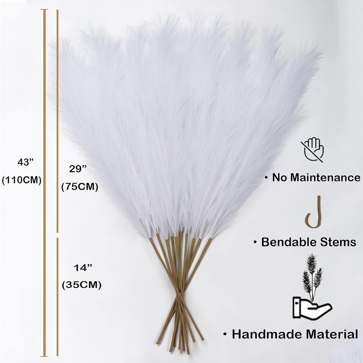 - High End Looking Faux Pampas Grass: It's actually made of a metal wire in the stem and silk feather, it holds shape very well. The pompass grass branches tall bulk is really soft and feather-like, with 15 branches on each stem, and the heads of each stem are designed so you can fluff them up for a fuller look