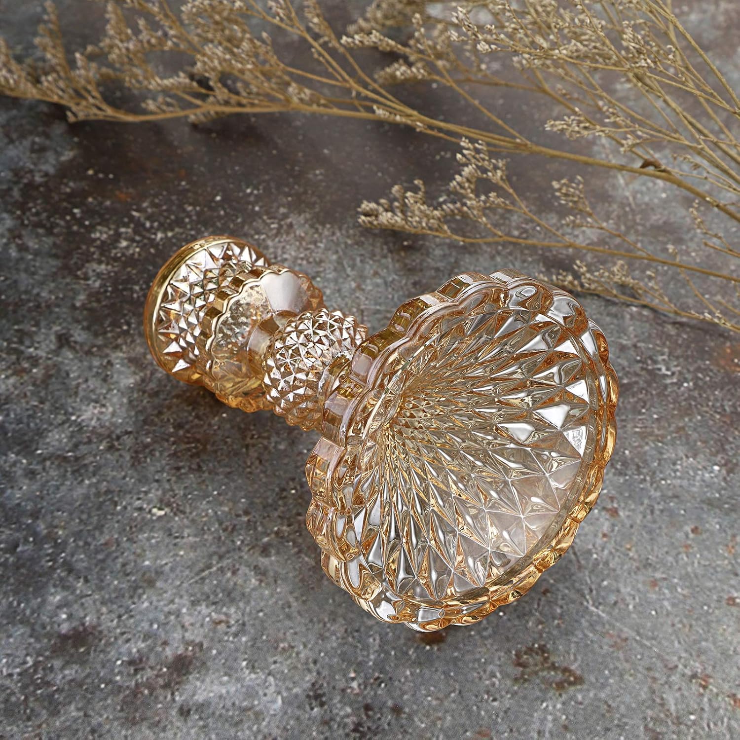 - Exquisite Ornament: Taper glass candlestick decorated with shiny and textured geometric patterns, looks gorgeous when with lit candle; it can be also used as a tiny vase or other purposes, will add a modern, simple or elegant atmosphere to your countertop.