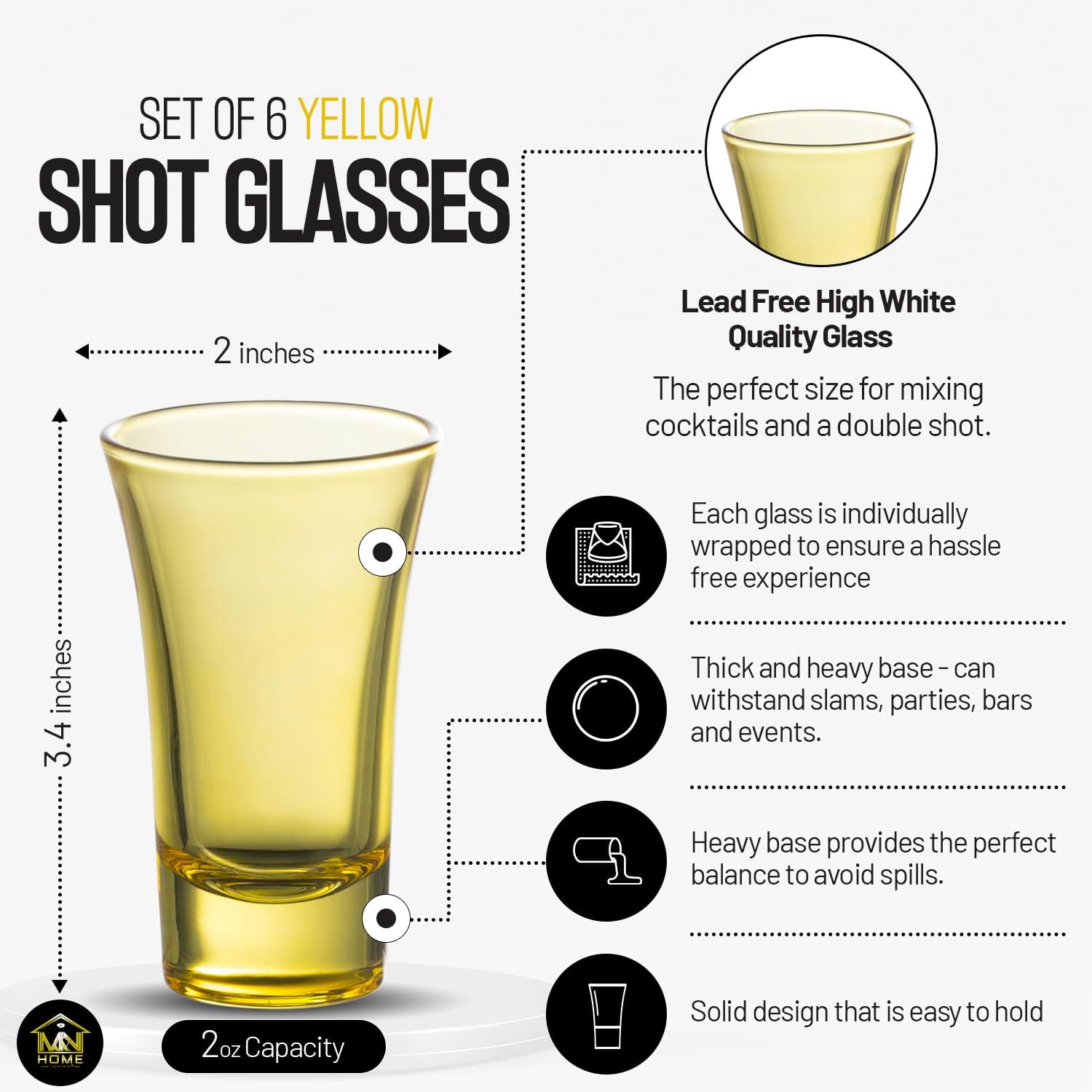 - Yellow Shot Glasses- Set of 6 fully colored yellow shot glasses. 2 Oz capacity shot glass, the perfect size for mixing cocktailsand a double shot. 3.4" High x 2" Diameter. Solid seamless design that is easy to hold and drink from. Each glass is individually wrapped to ensure a hassle free experience.