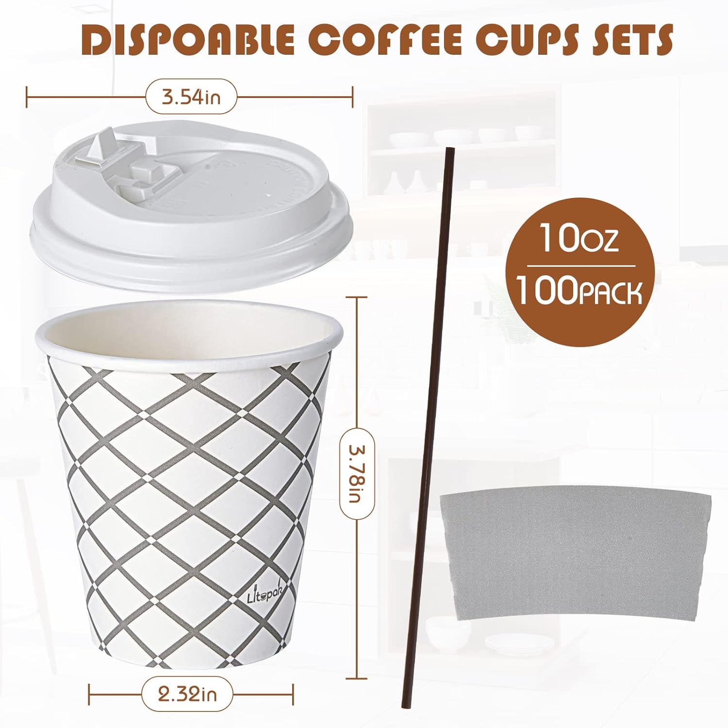 LITOPAK 100 Pack 10 oz Paper Coffee Cups with Lid, Sleeve, and Straws, Four Designs of Disposable Hot Coffee Cups for Home, Stores, and Cafes