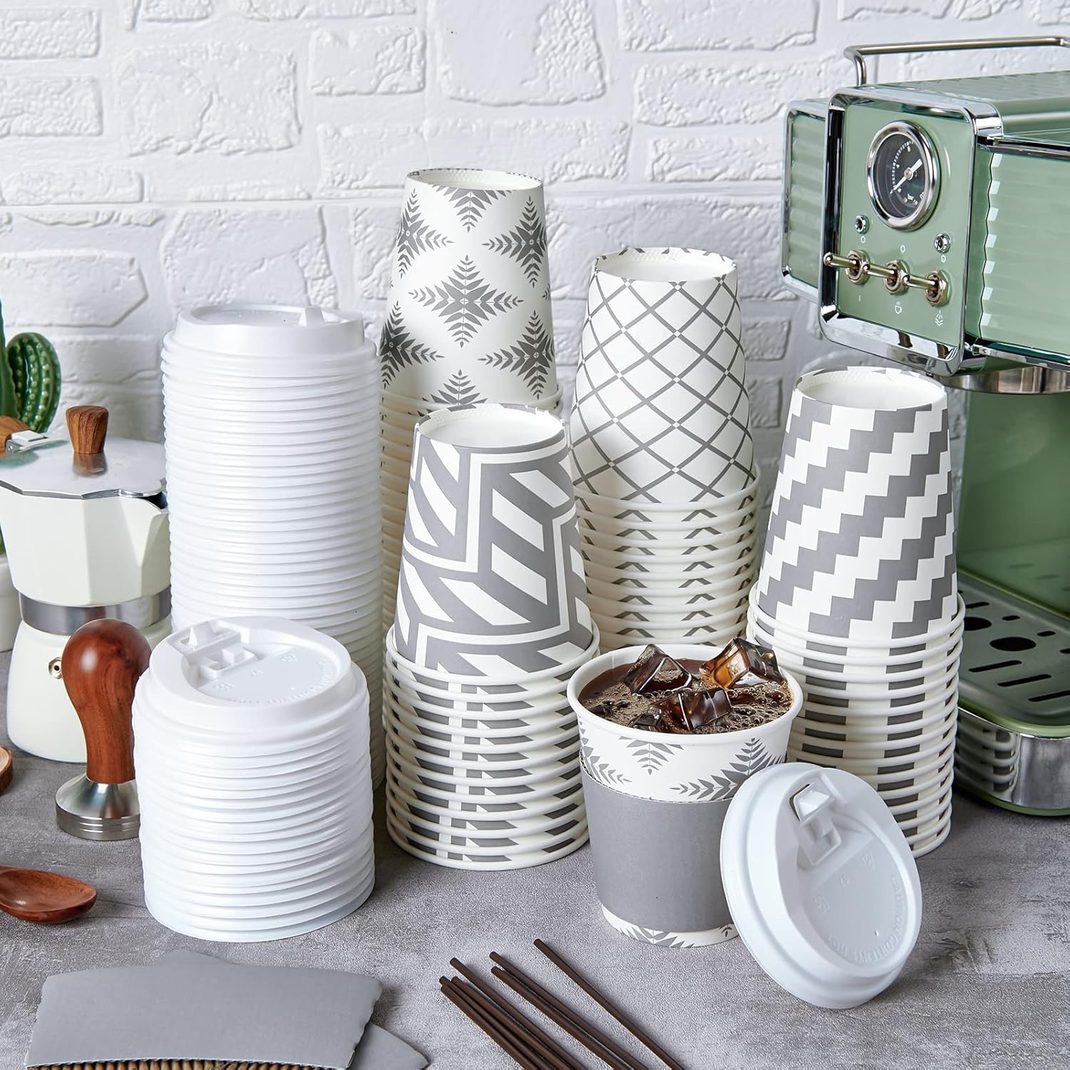 - Great Value Pack: You will receive a pack of 100 10 oz disposable cups, including 100 cups in four grey designs, 100 white lids, 100 grey cup sleeves, and 100 straws