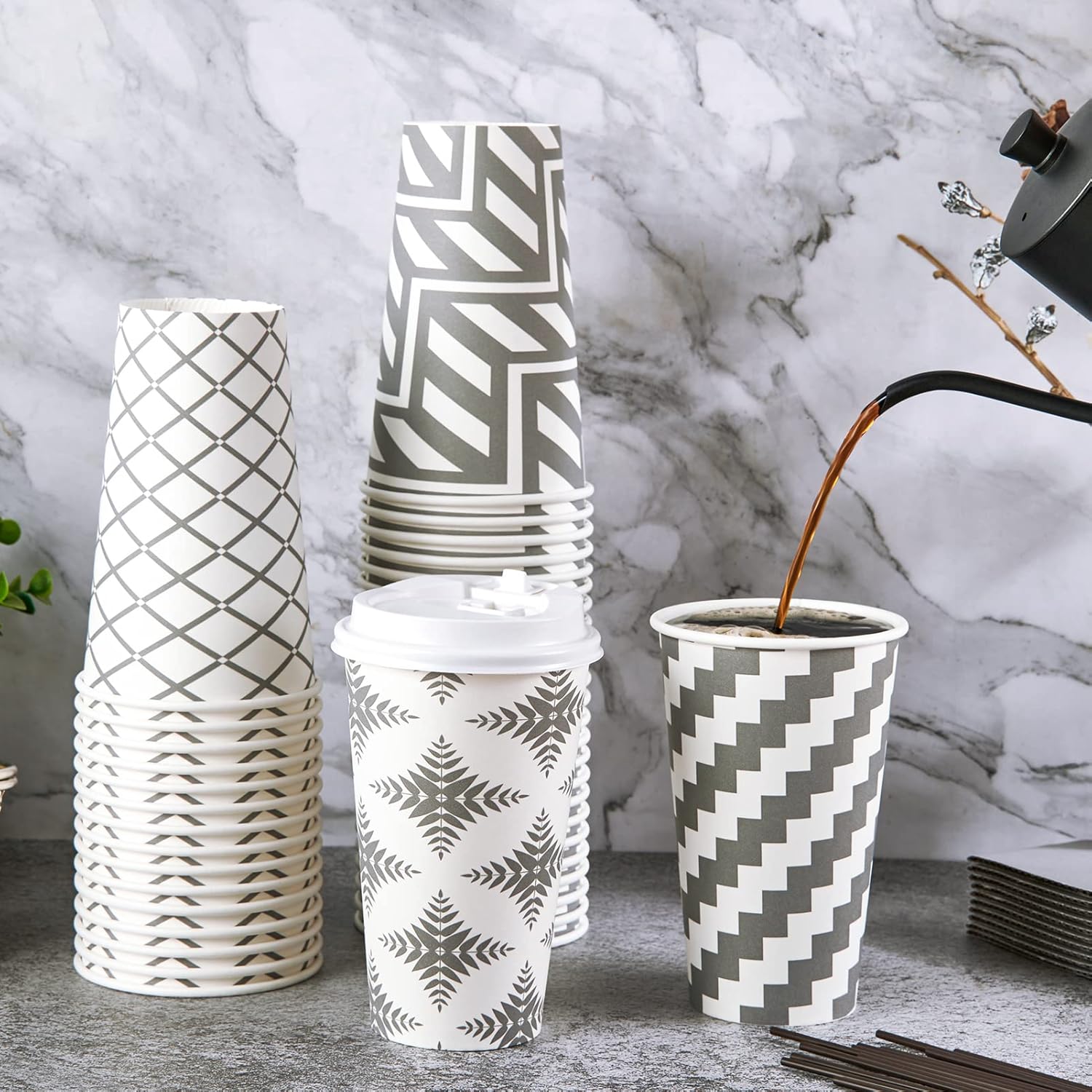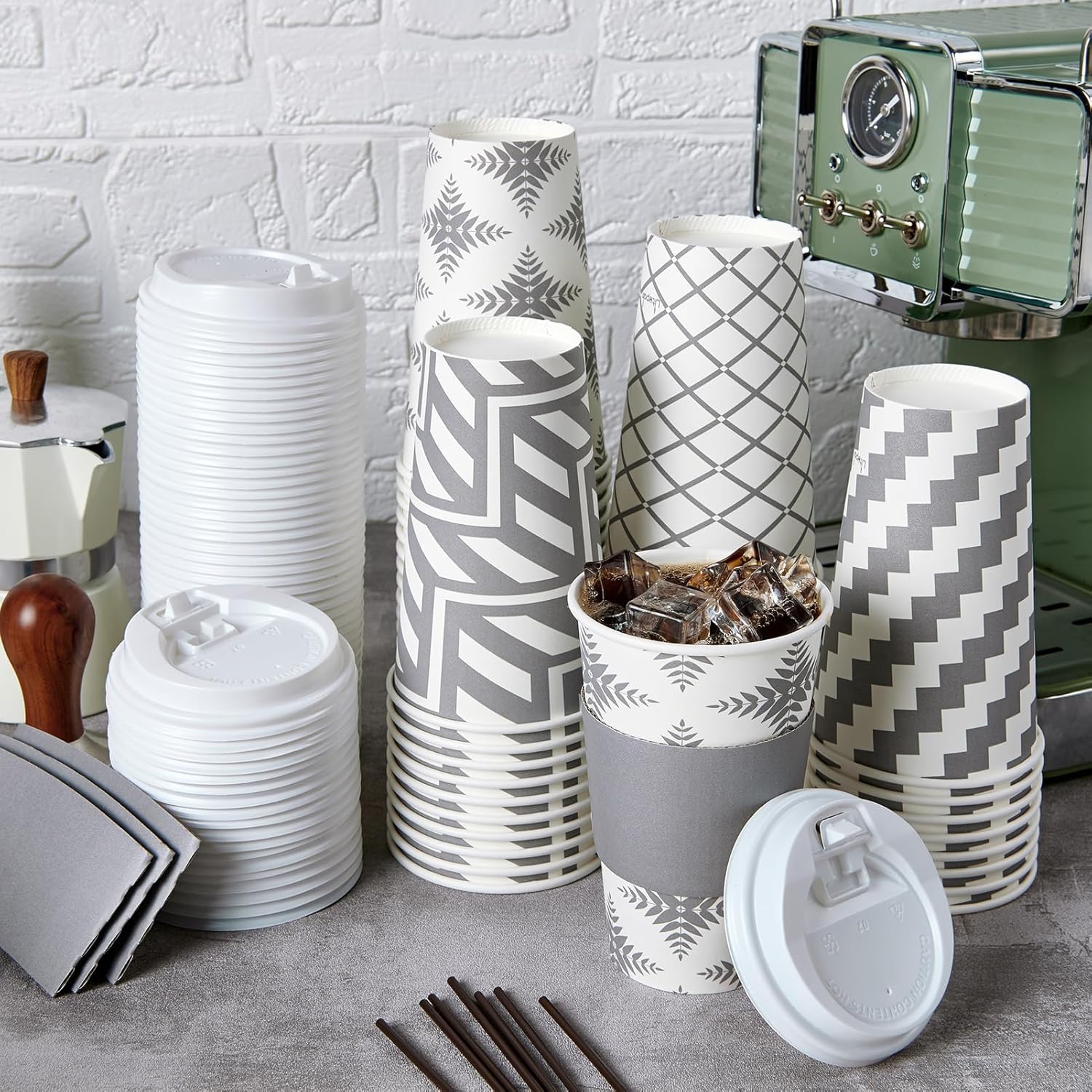 - Great Value Pack: You will receive a pack of 100 16 oz disposable cups, including 100 cups in four grey designs, 100 white lids, 100 grey cup sleeves, and 100 straws