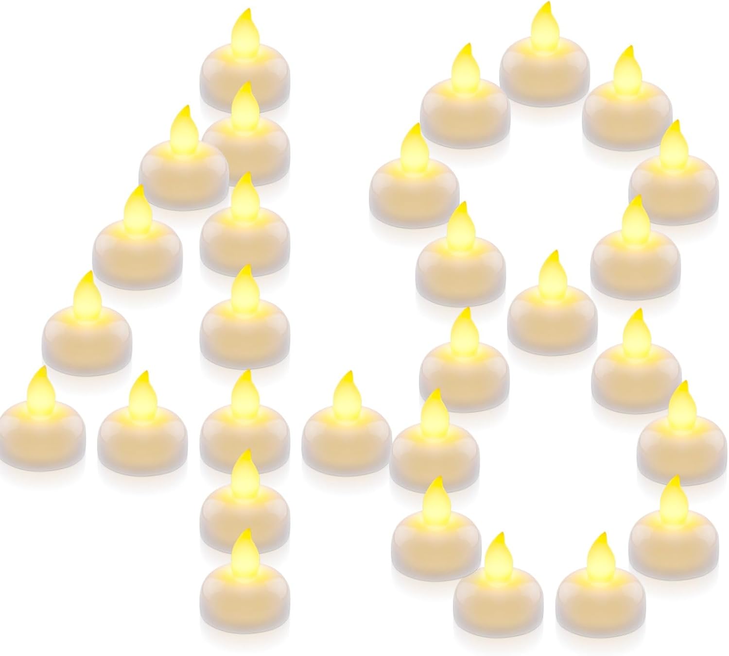 - [ Floating on water ]: floating tealights are (D1.5" X H1.6") completely waterproof; put these warm white light led tealight candles in your pool and vase or bowls filled with water to create a warm and romantic ambiance; Package include 48 x floating tealights (batteries installed)