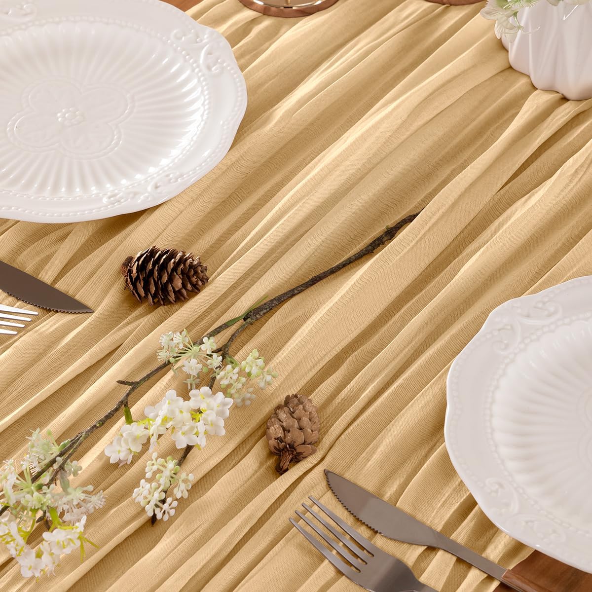 - 【Timeless Elegance】The delicate, airy wrinkles of cheesecloth fabric giving it a vintage, artisanal feel that brings warmth and character to your space. This timeless elegance ensures your party decorations and everyday table decor remain stylish season after season.
