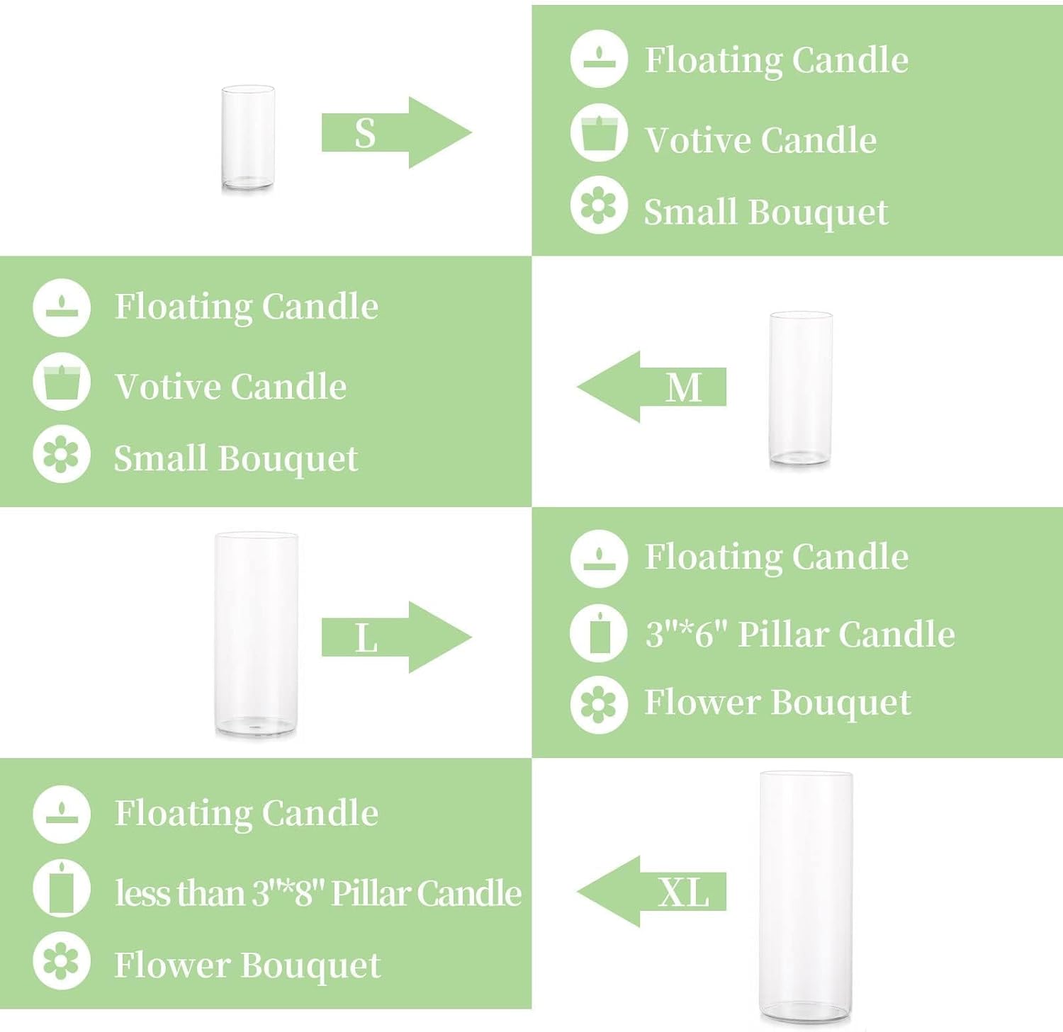 - Dual Purpose Candle Vases for Centerpieces: Large and medium sized glass vases work beautiful with 3'' pillar candles, 3'' floating candles and bouquet. Small size is for 2'' pillar candles, 4'' floating candles, votive candle, tealight candle and bud vase.