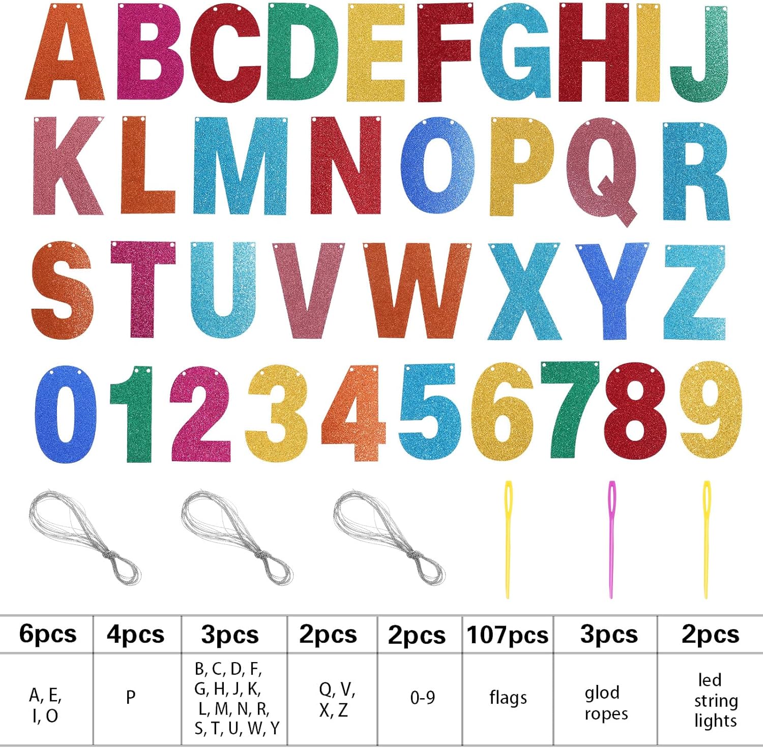 - DIY Banner Kit with Letters: you will get 107 pieces of letters and numbers, including 6 'A, E, I, O' letters, 4 'P' letters, 3 'B, C, D, G, H, J, K, L, letter M, N, R, S, T, U, letter W, Y, F shape' letters, 2 'Q, V, X, Z' letters and 2 '0-9' numbers, come with 3 ropes; Nice combination meet your various parties decorative demands