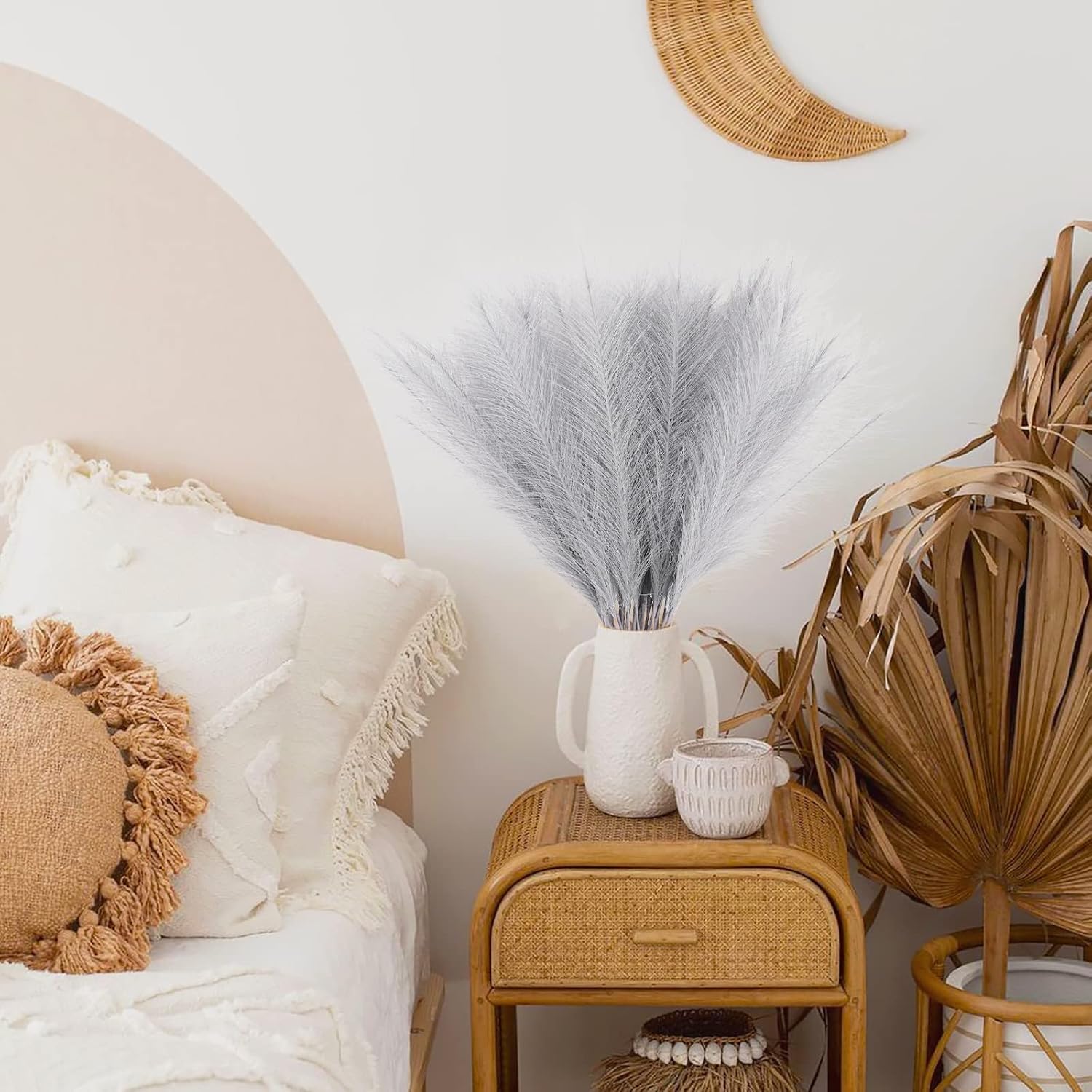 - Grey Pampas Grass Decor: You will get a pack of 50pcs artificial pampass grass, each stem 21.6”, and the heads of each stem is designed you can fluff them up for a fuller look, create a chic minimalist, or Bohemian modern display to complement your existing home arrangement