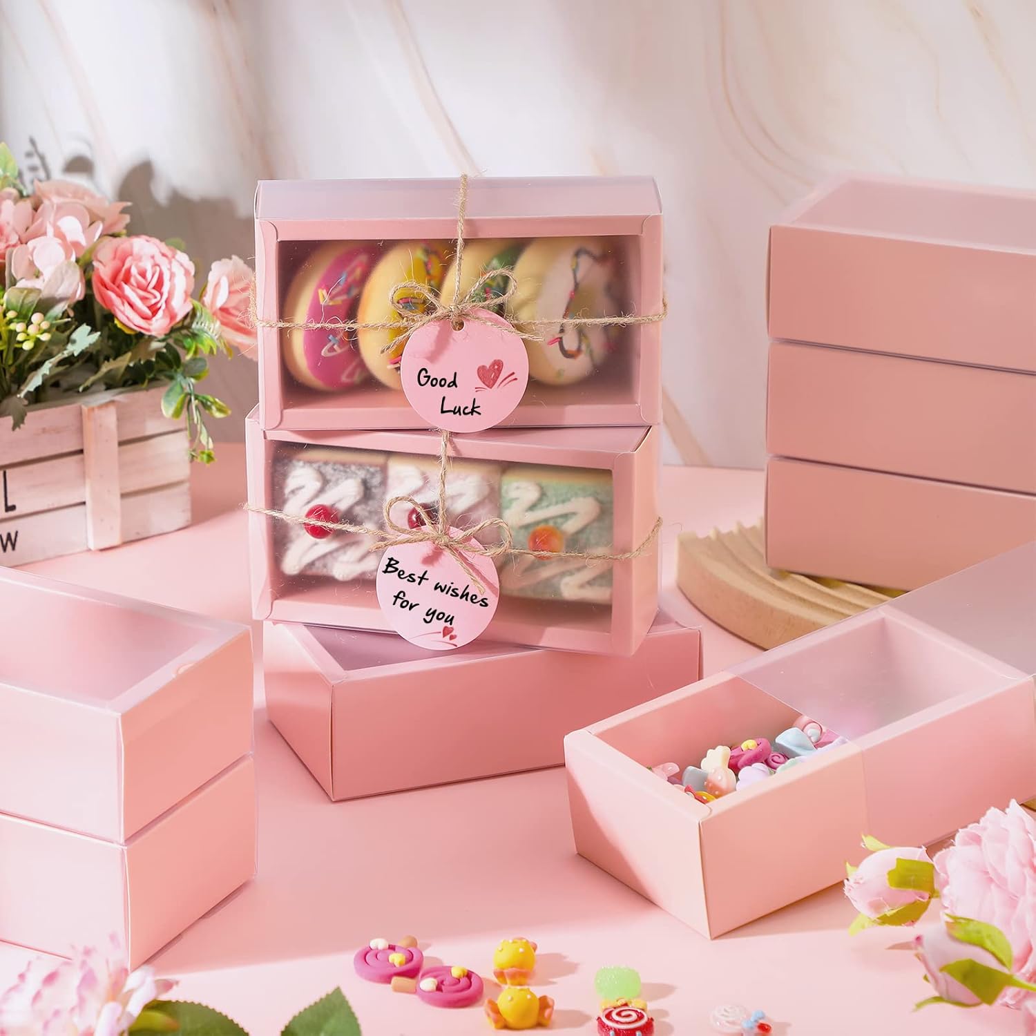 - What Can You Get: the package comes with 50 sets of pink kraft boxes with window, 50 pieces of blank gift tags and 1 bundle of 30 meters/ 98.4 feet long jute string, practical combination to meet your using demands and sharing requirements