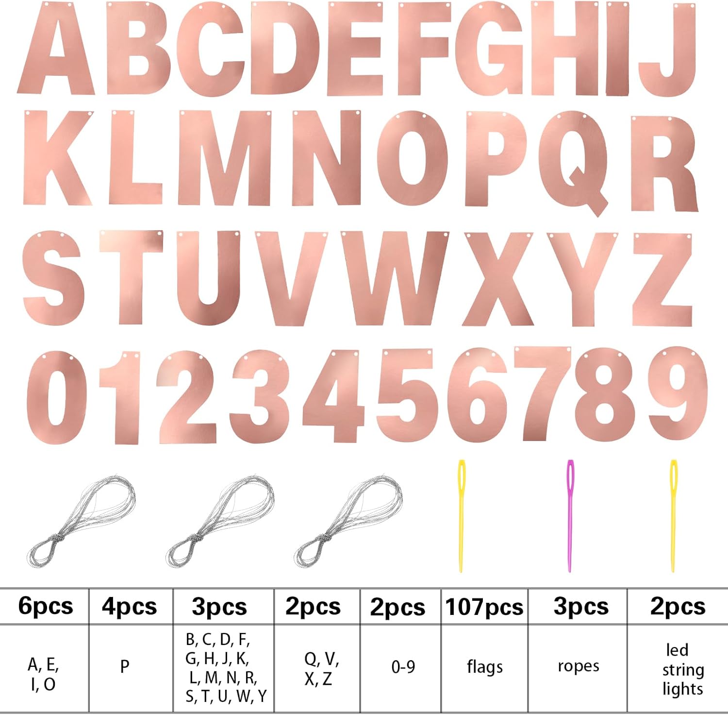 - DIY Banner Kit with Letters: you will get 107 pieces of letters and numbers, including 6 'A, E, I, O' letters, 4 'P' letters, 3 'B, C, D, G, H, J, K, L, letter M, N, R, S, T, U, letter W, Y, F shape' letters, 2 'Q, V, X, Z' letters and 2 '0-9' numbers, come with 3 ropes; Nice combination meet your various parties decorative demands