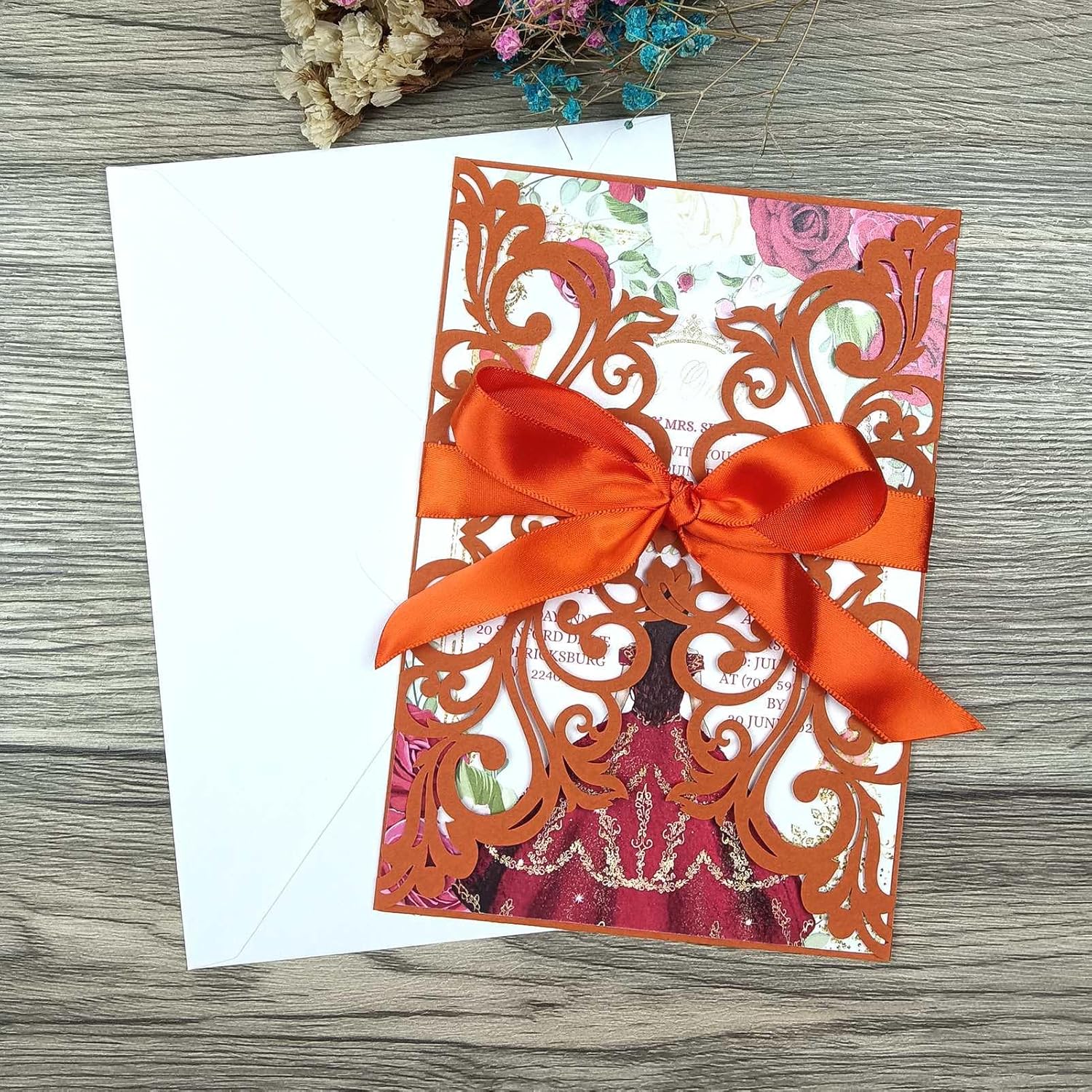 - Package including: 25 * Laser Cut Invitations Pockets + 25 * Cream Envelopes+25 * Blank Inner Sheets +25 * Ribbons