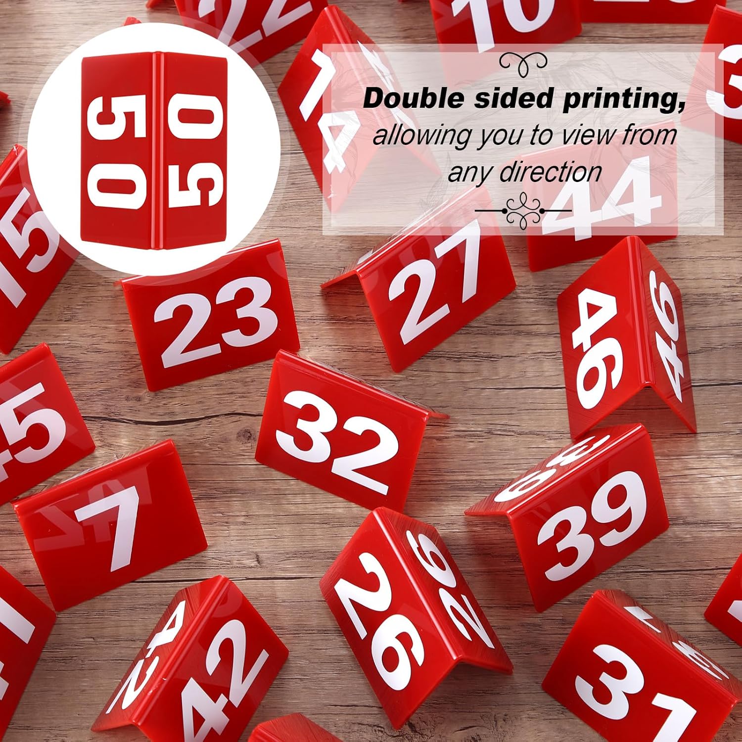 - Complete Table Number Set: the package comes with 50 pieces of table numbers, enough to meet your daily needs, bold white numbers on red background, and the numbers printed on are from 1 to 50, they can stay standing on their own, no need of glue and can easily be placed on tables