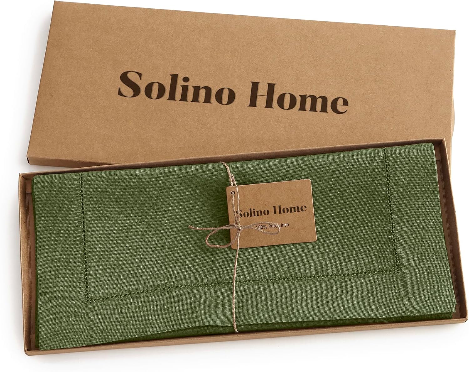 Solino Home Linen Table Runner 48 Inches - 100% Pure Linen Olive Hemstitch Table Runner 14 x 48 Inch Ideal for Dresser and Coffee Tables - Classic Hemstitch - Thanksgiving