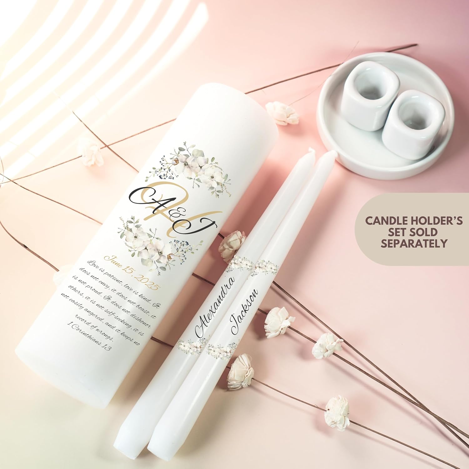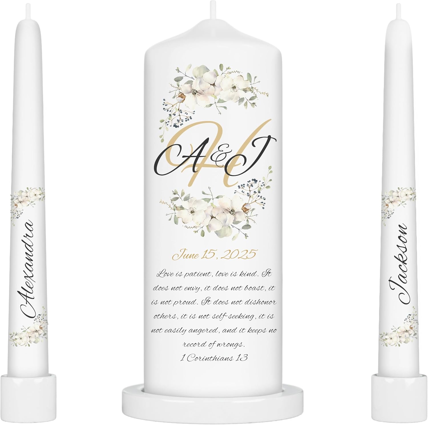 Unity Candles for Wedding, Modern Unity Set, Custom and Personalized Pillar and Taper Candles with Bible Quote, Unscented White Premium Wax, Religious and Wedding Ceremony, Special Events (Camellia)