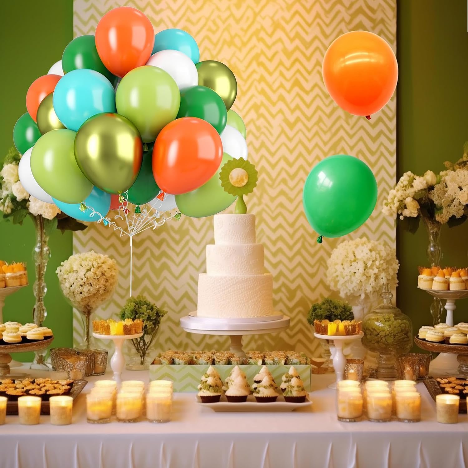 Orange Blue and Green Balloons, Assorted Latex Balloons, Orange Teal Turquoise Blue Fruit Green Metallic Green and White Party Balloon, for Dinosaur Safari Jungle Themed Birthday Party Decor