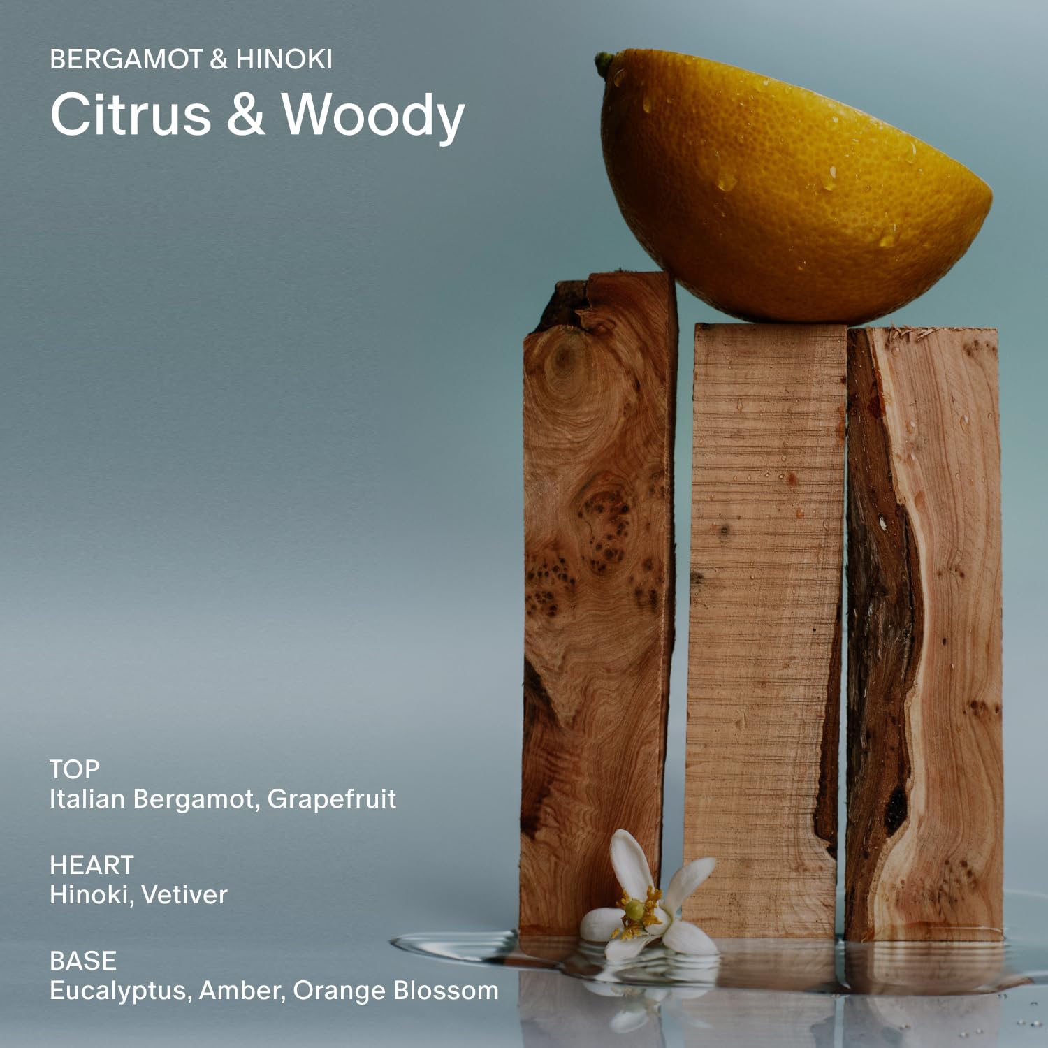 - Scent Notes — Top: Italian Bergamot, Grapefruit. Heart: Hinoki, Vetiver. Base: Eucalyptus, Amber, Orange Blossom.