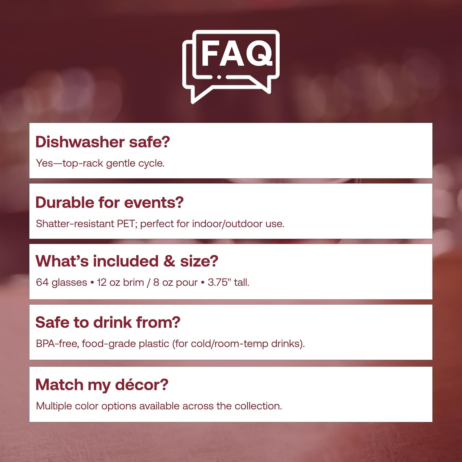 - DISPOSABLE FOR EASY CLEANUP – Enjoy the elegance of real glass with the convenience of plastic wine glasses disposable design. Simply toss or recycle after the event, keeping cleanup easy.