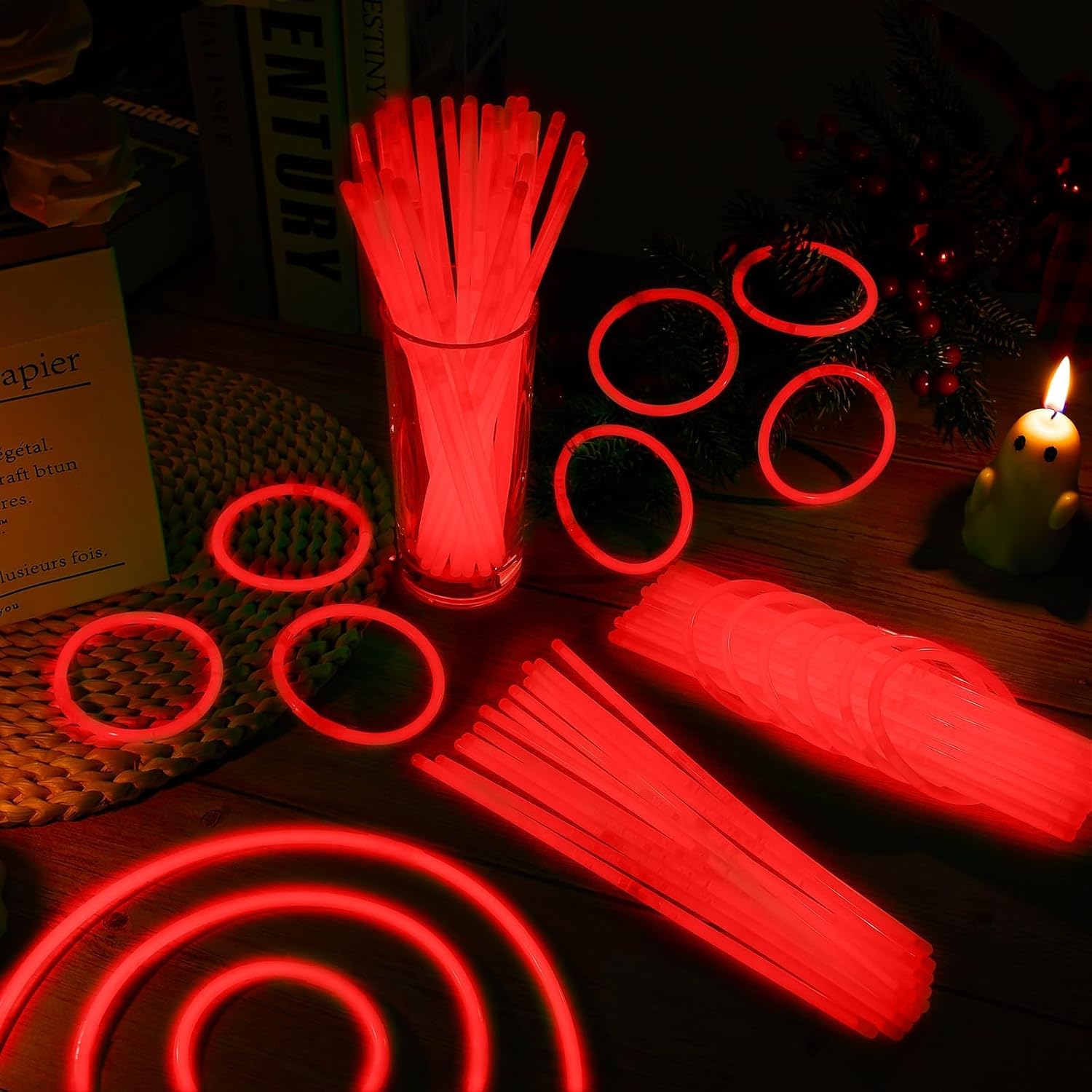 100 Pack 8” Red Glow Sticks Bulk with 100 Connectors Neon Glow In The Dark Party favors Supplies for Holiday Birthday Party Decoration (Red)