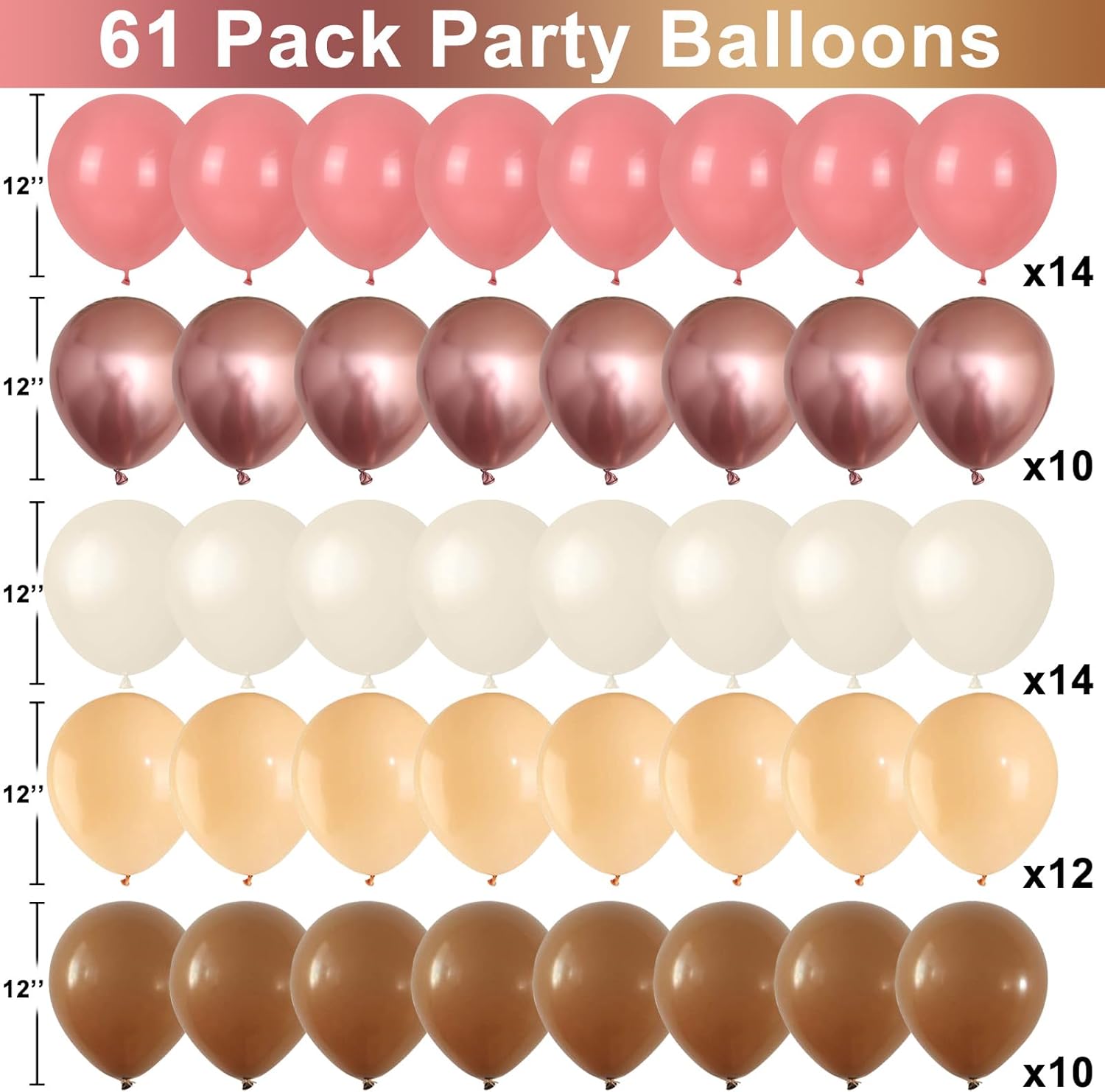 - ✨Boho Balloons Set: Our package includes 61pcs 12inch latex balloons (14pcs dusty pink balloons, 10pcs metallic rose gold balloons, 14pcs sand white balloons, 12pcs nude balloons, 10pcs coffee brown balloons) and 1pc balloon ribbon. Perfect for boho baby shower, birthday, or any occasion where elegance is key. Elevate your decor with these sleek and polished light brown pink latex balloons that will leave a lasting impression on your guests.