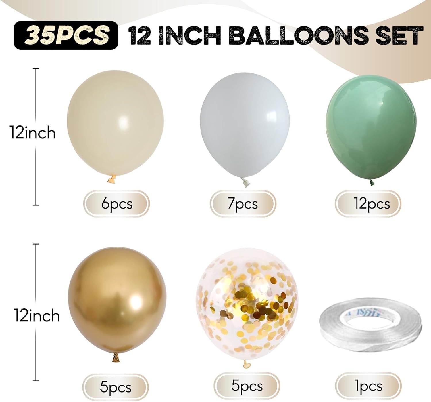 - Sage Green Gold Balloons Set: 35pcs 12 inch sage green party decorations latex balloons, include 12pcs sage green balloons, 7pcs beige balloons, 6pcs sand white balloons, 5pcs metallic gold balloons, 5pcs gold confetti balloons and 1pc ribbon