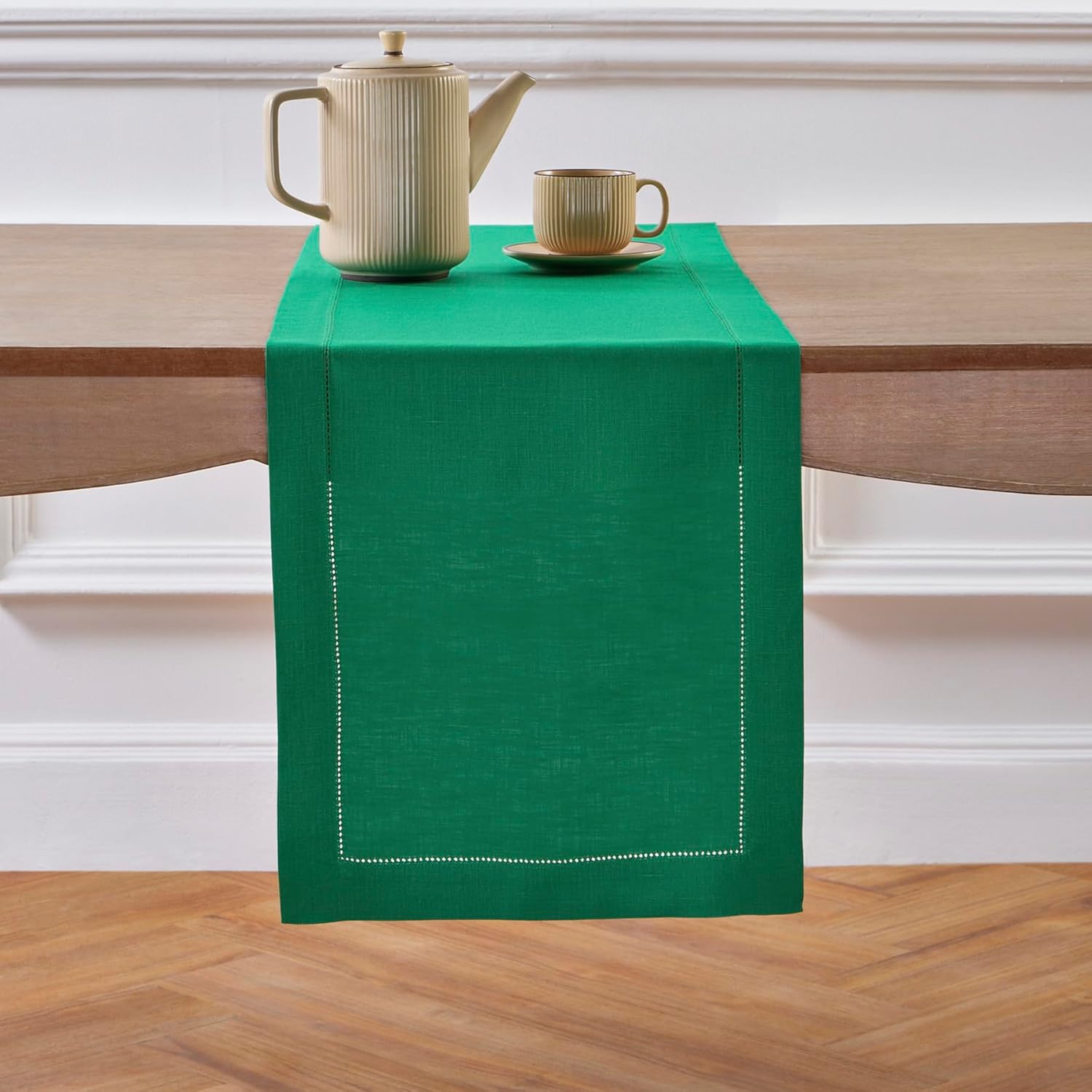 Solino Home Linen Emerald Green Table Runner 72 Inches Long - 100% Pure Linen Hemstitch Table Runner 14 x 72 Inch for Dresser, Dining, Christmas - Classic Hemstitch