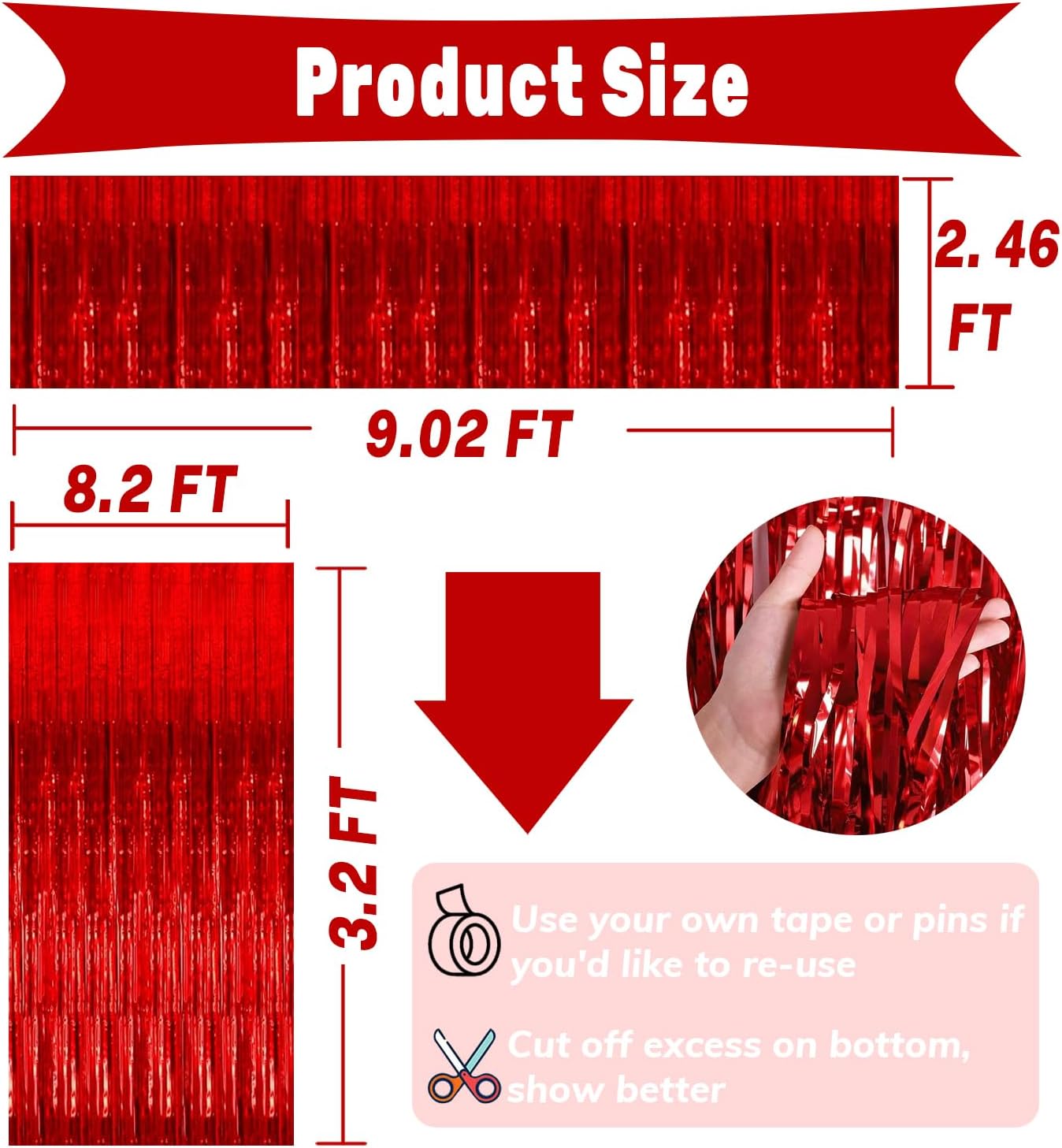 - Material: Plastic 2 Pack Party Streamers: 3.2ft x 8.2ft(W*L) 2 Pack Foil Fringe Tinsel Table Skirt: 30inx 108in(W*L) Please confirm the size you need before buying. Peel off the sticker on the back and stick it on the door you want to decorate, the size fit for any party backdrop, which can create an impressive decorative effect.