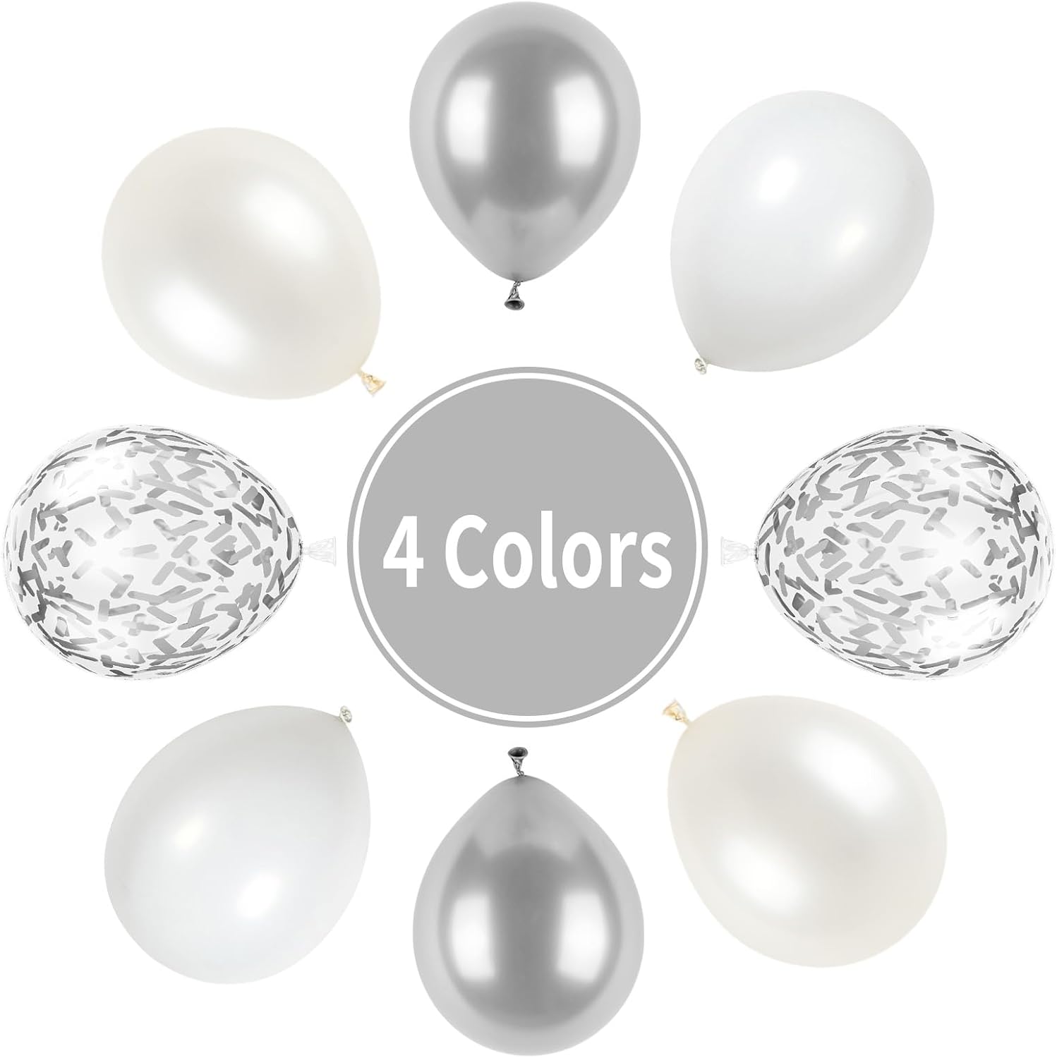 - 【12Inch Party Balloons Set】: The white and silver balloons set includes 20pcs matte white balloons, 15pcs pearl white balloons, 10pcs metallic silver balloons, 15pcs silver confetti balloons, 1pc silver ribbon. 61pcs in total. Elevate your celebrations with our birthday party balloons!