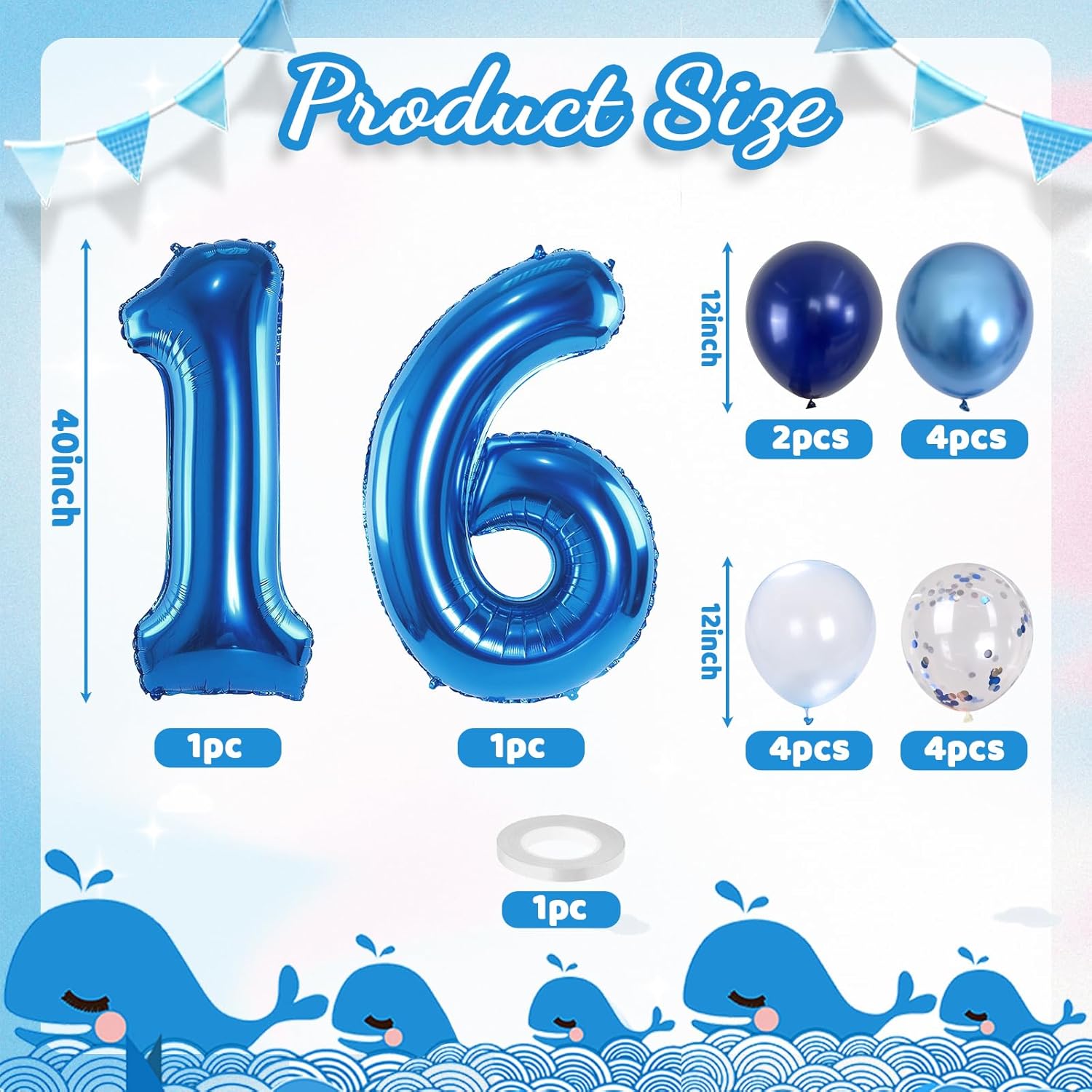 - π Dark Blue Number 16 Balloon: Our package included 40 inch foil number 16 balloon(2pcs), 12 inch metallic blue balloon(4pcs), blue silver confetti balloon(4pcs), pastel blue balloon(4pcs), Light Navy Blue Balloon(2pcs), 1pcs straw and 1 roll ribbon. Simply inflate the balloon using the straw, and you're ready to party! Navy blue number foil balloons are the best for girls or boys birthday party decoration.