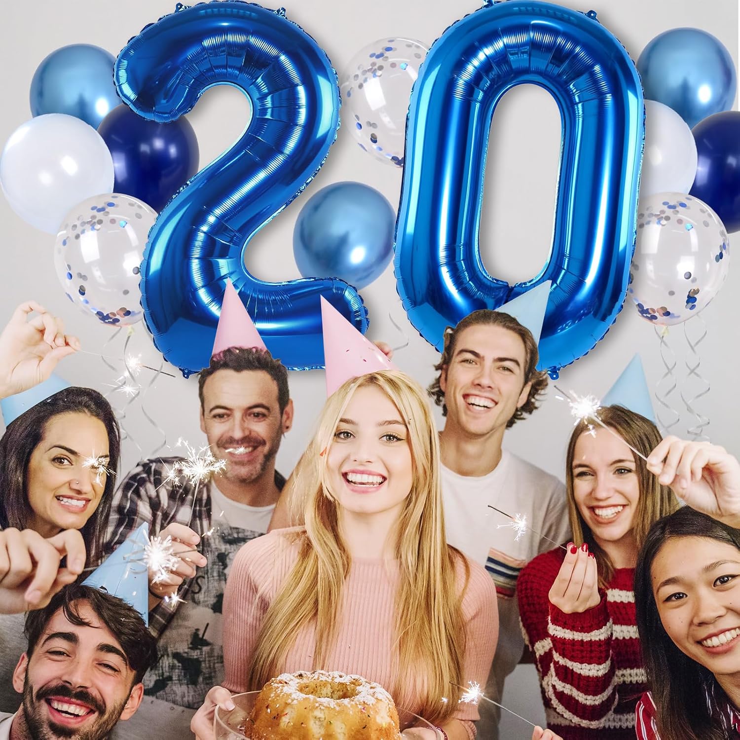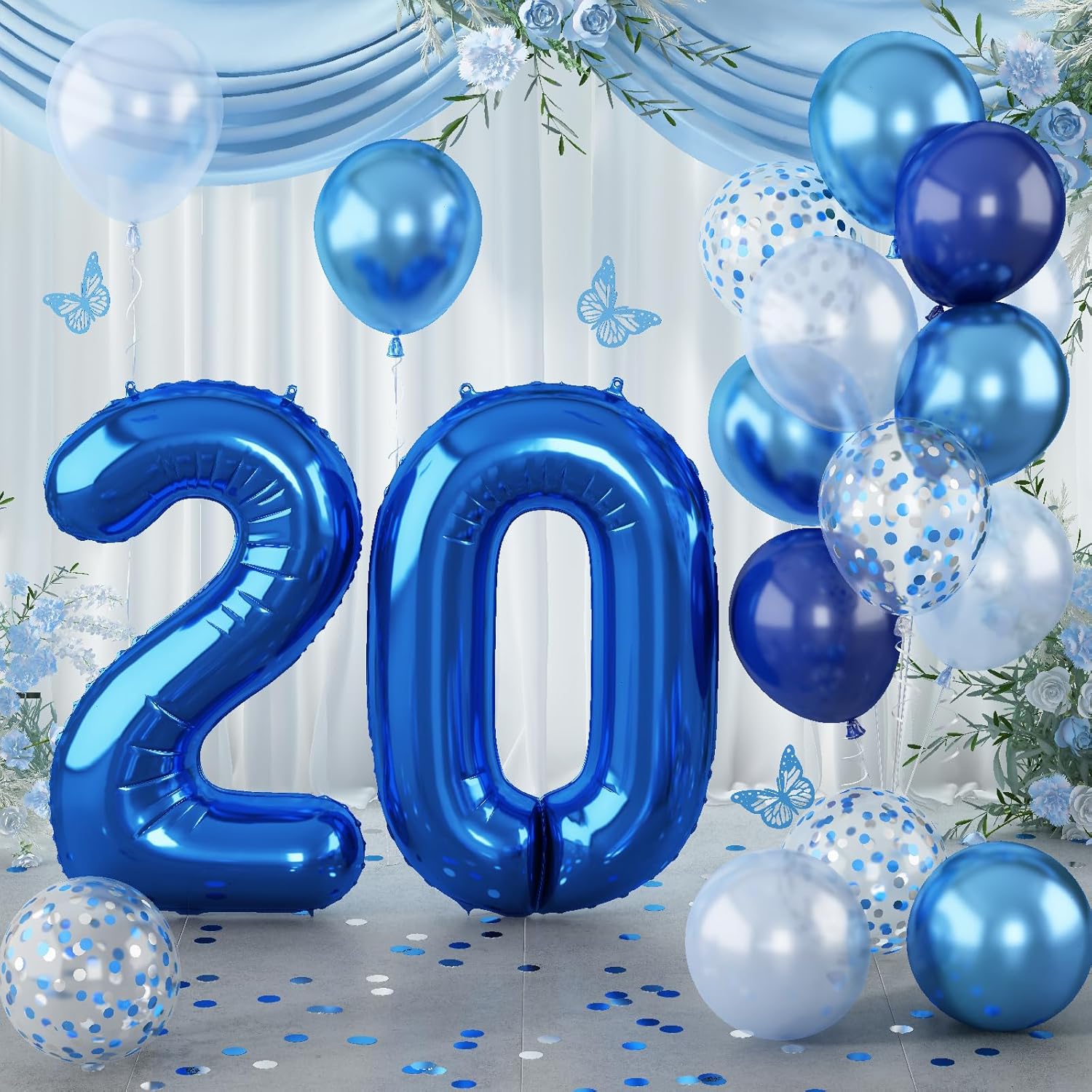 - π Dark Blue Number 20 Balloon: Our package included 40 inch foil number 20 balloon(2pcs), 12 inch metallic blue balloon(4pcs), blue silver confetti balloon(4pcs), pastel blue balloon(4pcs), Light Navy Blue Balloon(2pcs), 1pcs straw and 1 roll ribbon. Simply inflate the balloon using the straw, and you're ready to party! Navy blue number foil balloons are the best for men or women birthday party decoration.