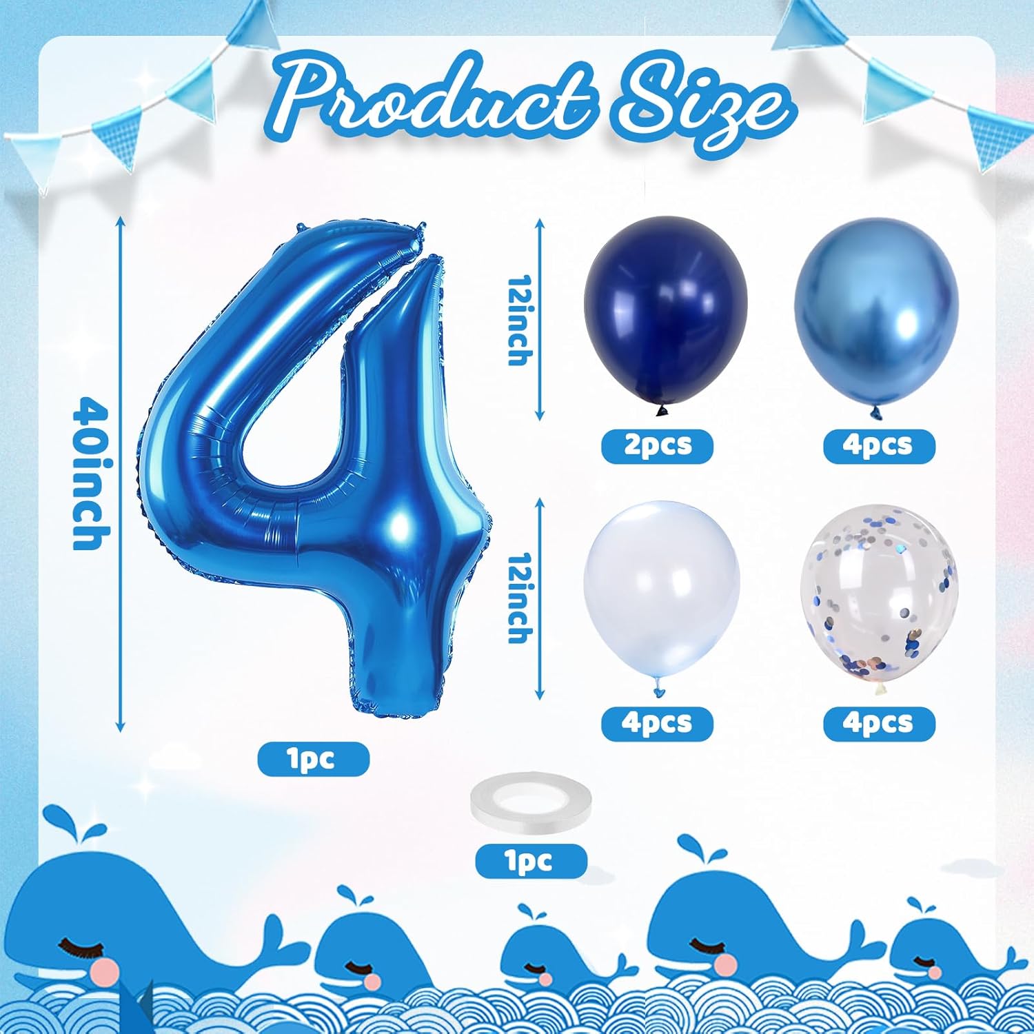 - π Dark Blue Number 4 Balloon: Our package included 40 inch foil number 4 balloon(1pcs), 12 inch metallic blue balloon(4pcs), blue silver confetti balloon(4pcs), pastel blue balloon(4pcs), Light Navy Blue Balloon(2pcs), 1pcs straw and 1 roll ribbon. Simply inflate the balloon using the straw, and you're ready to party! Navy blue number foil balloons are the best for girls or boys birthday party decoration.