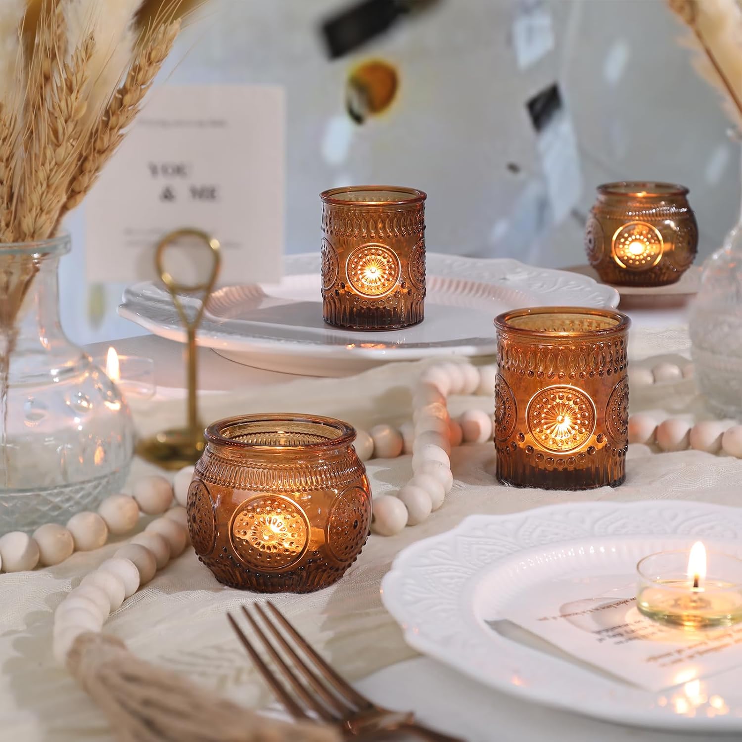 DARJEN 12Pcs Amber Votive Candle Holders - Vintage Glass Candle Holders for Flameless LED Tea Waxes, Tealight Candle Holder for Wedding & Home Table Decor, Vintage Parties