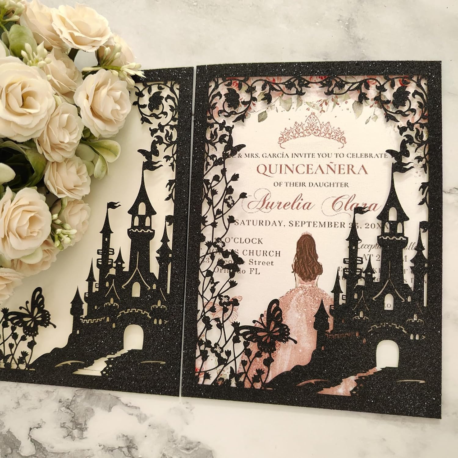 20PCS Castle Pocket Invitations, Quinceanera Invitations with Envelopes, Princess Invitation, Laser Cut quince invites (glitter black)