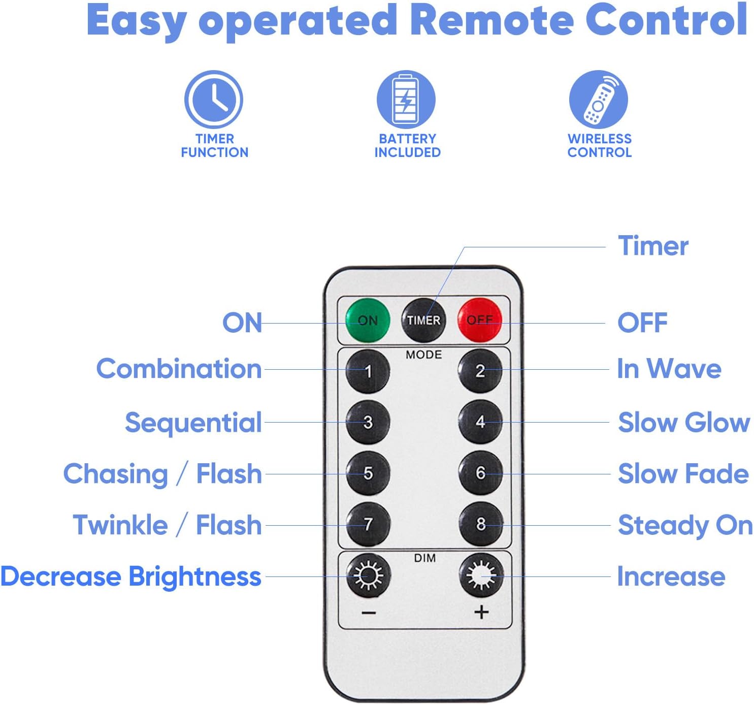 - Remote Control Convenience: Easily switch between 8 unique lighting modes and adjust brightness with the included remote; features timer for automatic 6 hours on, 18 hours off cycle.