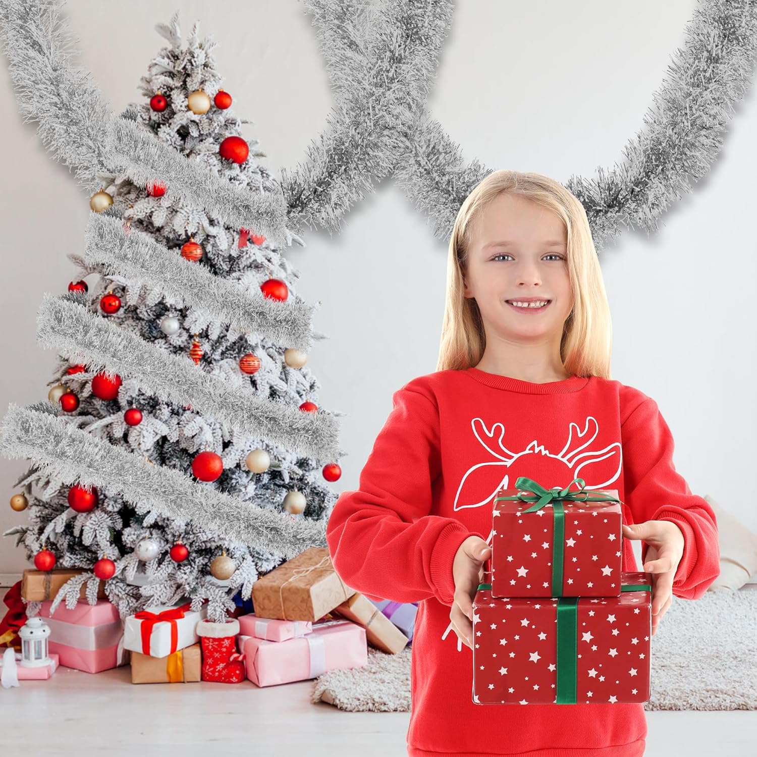 - DIMENSIONS: The Christmas tinsel garland measures 32.8 Ft / 10 M (L) X 3.54 in / 9 CM (W), with great length and thickness to meet your needs in various party and home decorations