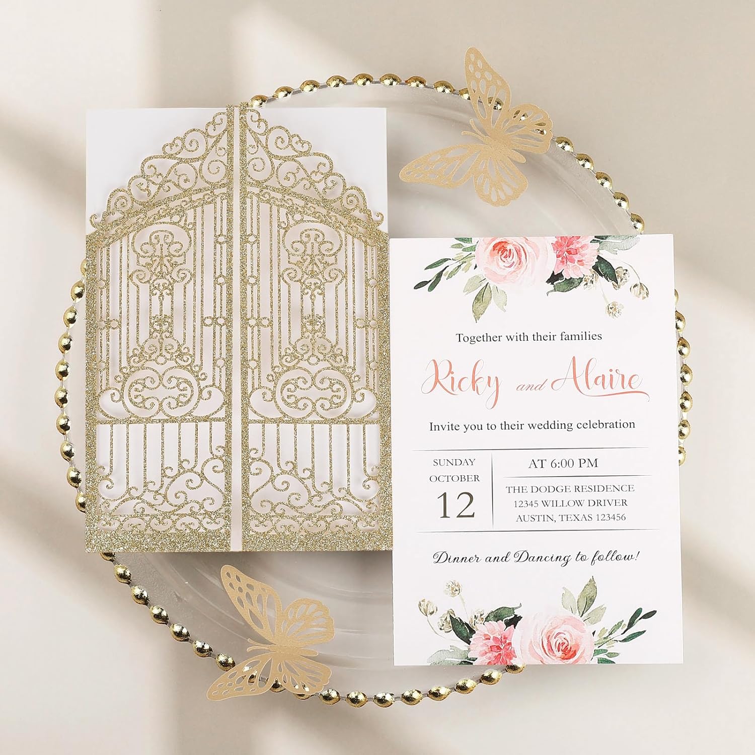 - Glitter Invitation Pocket: Gold wedding laser cut pocket, made of glitter paper, and design as the fence hollow out gate fold shape, three-dimensional and textured material making your invitation more elegant, luxurious, and mysterious.