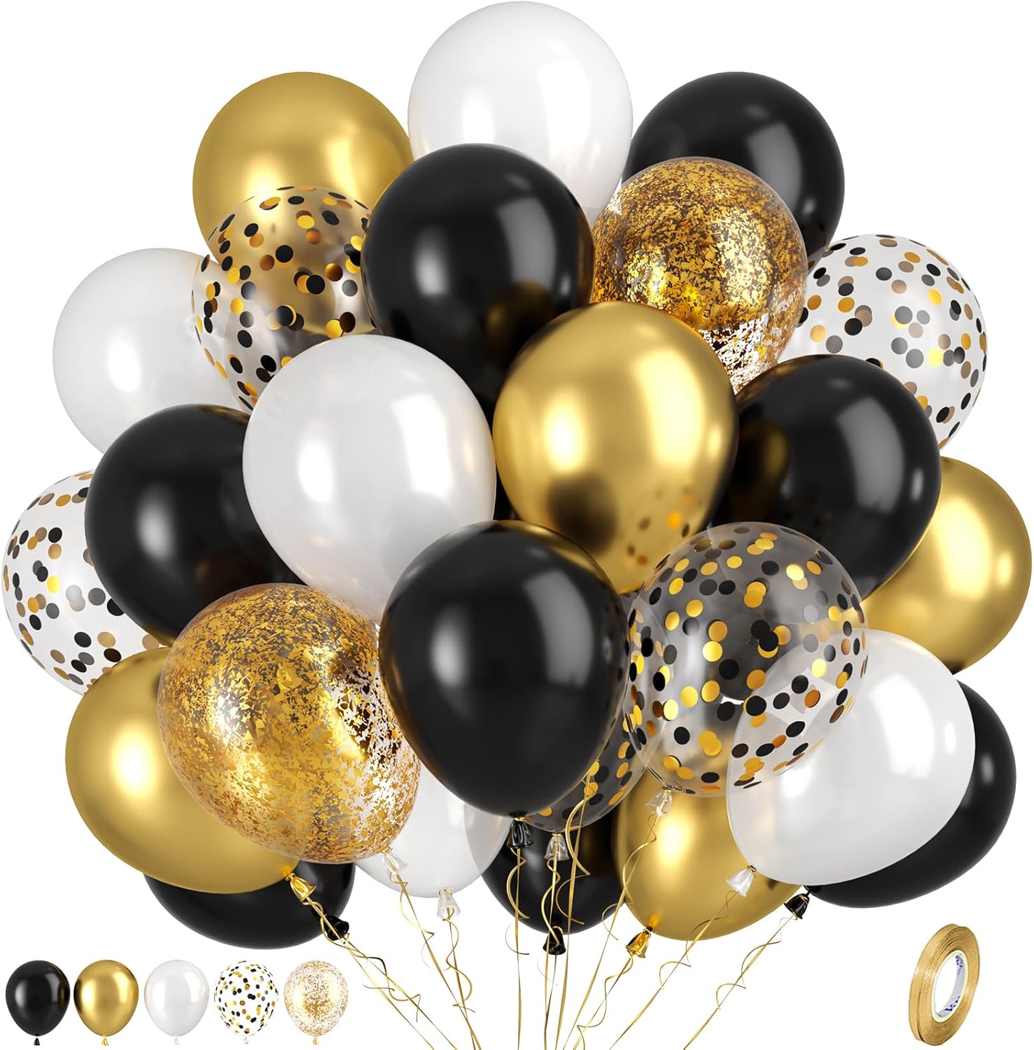- 12 inchs Gold and Black Balloons Set: 12pcs matte black balloons, 10pcs metallic gold balloons, 8pcs gold confetti balloons, 8pcs black and gold confetti balloons, 12pcs pearl white balloons, 1pcs gold ribbon in our party balloons set. From birthday to wedding, make your events unforgettable with our top-notch, reliable balloons that add a touch of elegance and fun.