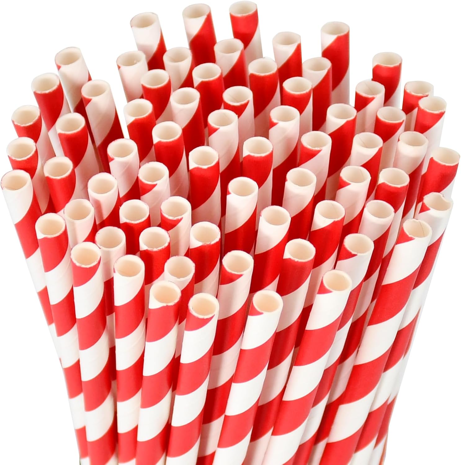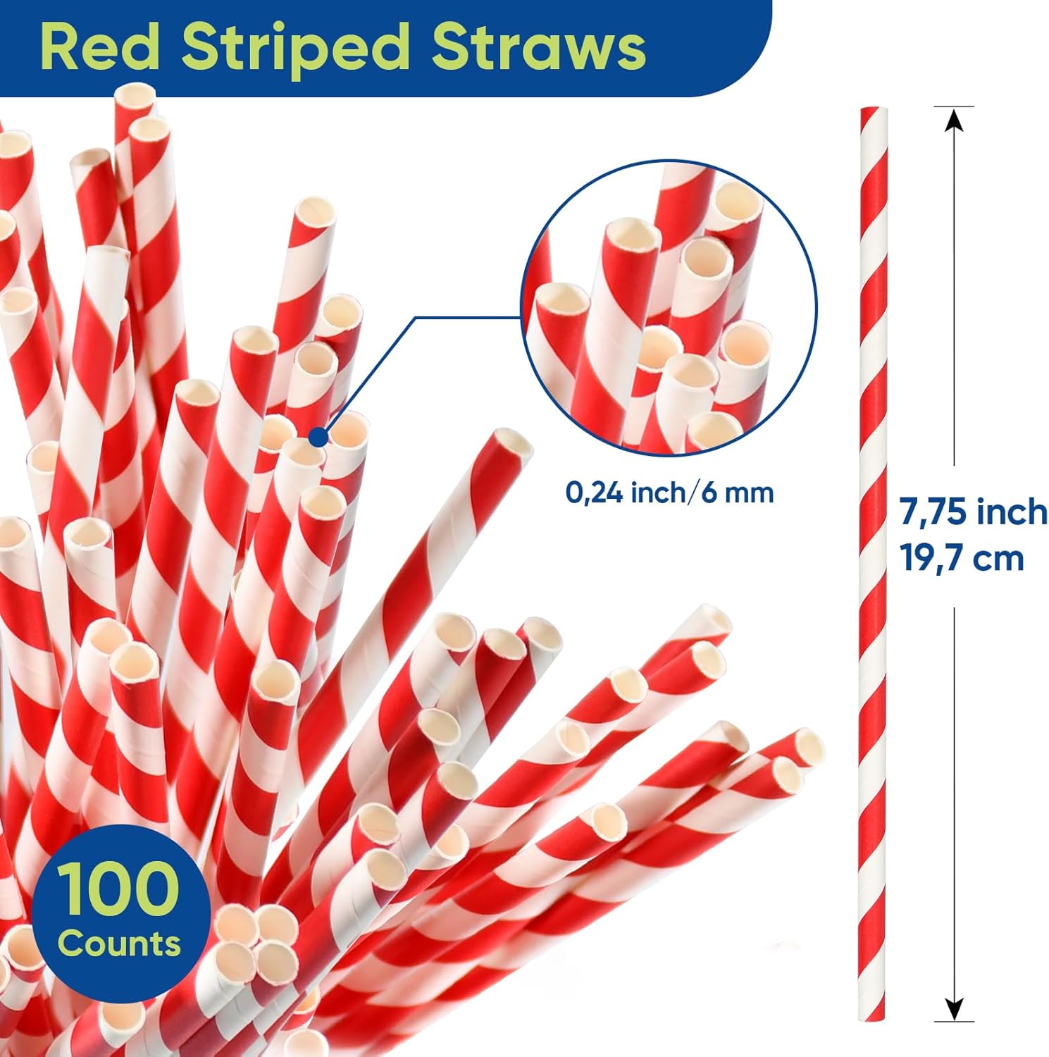Disposable 7.75 inch Red White Striped Paper Straws Biodegradable 100 Counts - for Drinking, Cocktail, Decoration, Party, Crafts