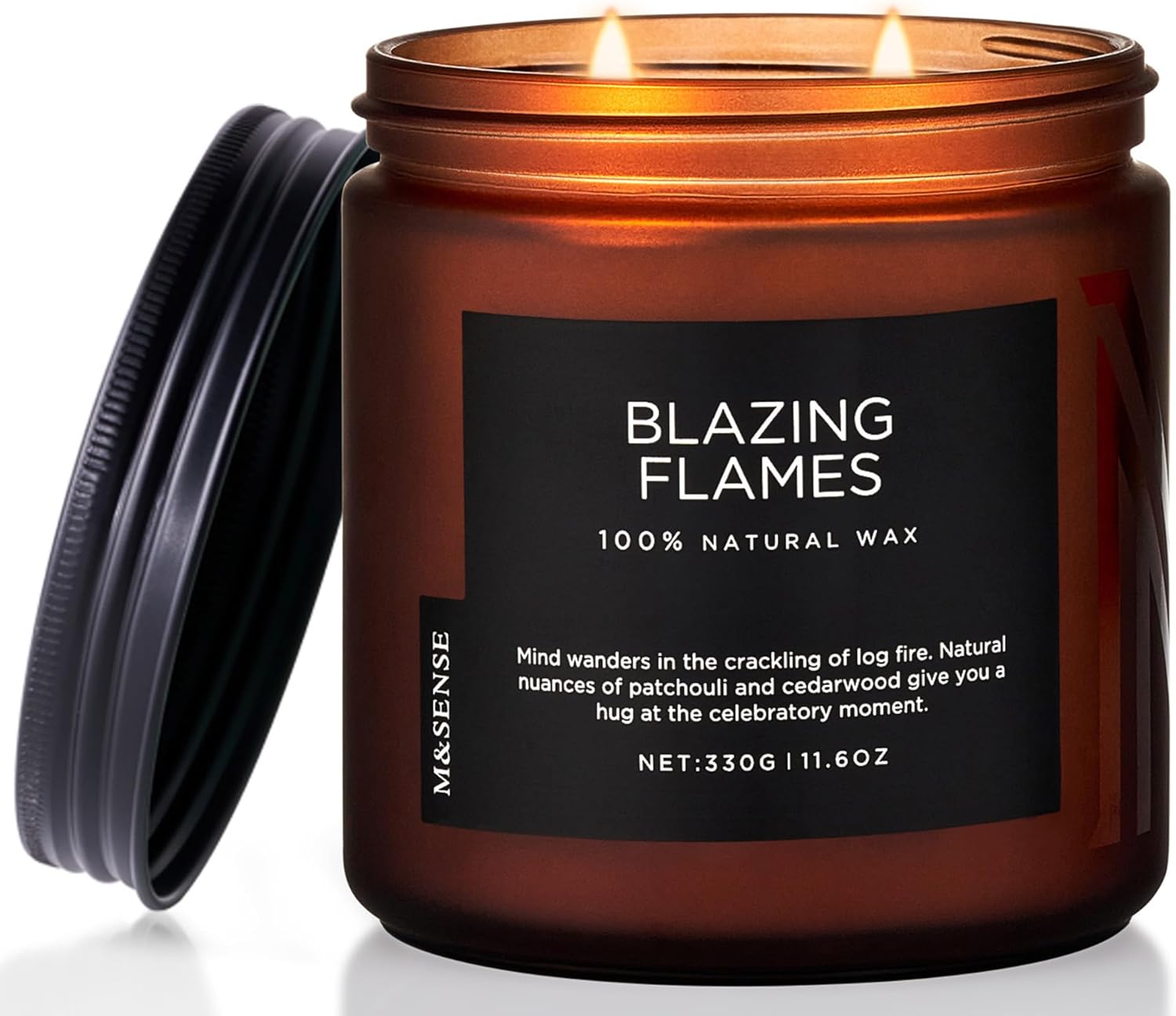 M&SENSE Blazing Flame Scented Candles with Log Fire - Cade & Patchoulli Scent, 70 Hours 11.6oz Natural Soy Wax for Home Decor Housewarming Gift, 2 Cotton Wick Candle for Celebration