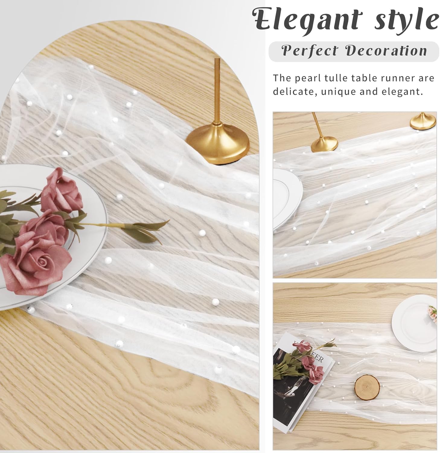 - 【Exquisite Workmanship】 These romantic table runners are made of premium tulle. Soft feeling, sheer, reusable, easy to clean and fade resistant. Delicate pearls embellished table runner works perfectly for many types of event decor, which will add a ton of elegance to any space.
