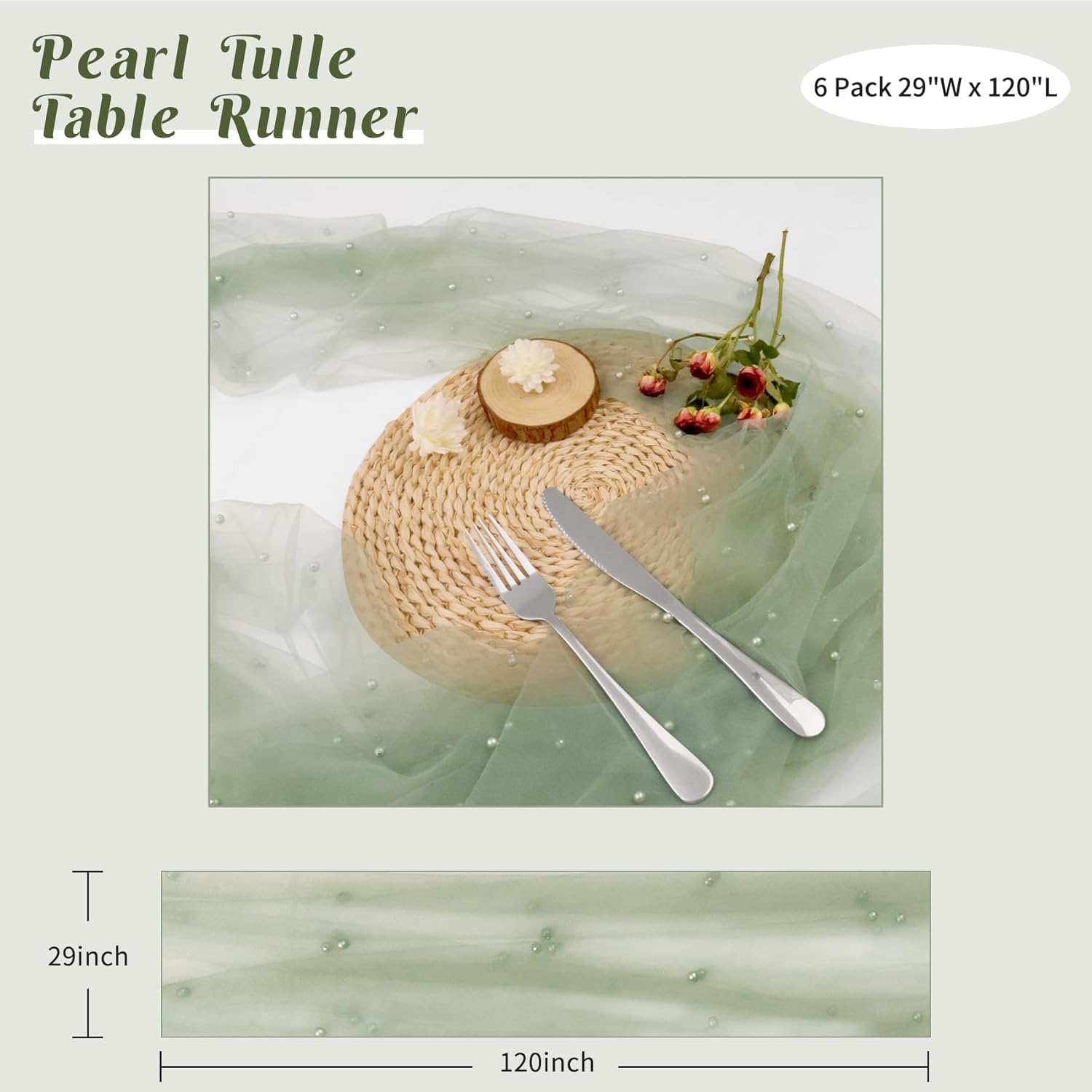 Set of 6 Pearl Table Runner 29 x 120 Inch Sage Green Tulle Fabric Lace Table Runners Boho Rustic Table Runners for Bridal Shower Birthday Party Wedding Arch Aisle Veil Dessert Table Decor(Sage Green)