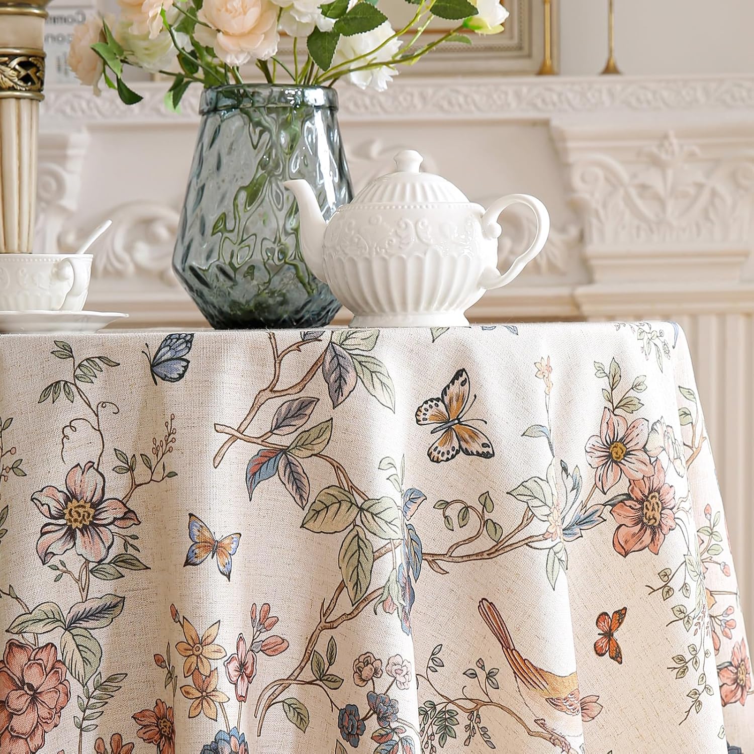 ISAENNE Designer French Light Beige Round Tablecloth,Linen Florals and Birds Pattern Table Cloth,Anti-Wrinkle Decorative Tablecloths for Dining Thanksgiving Kitchen,Diameter 67"-Cornucopia