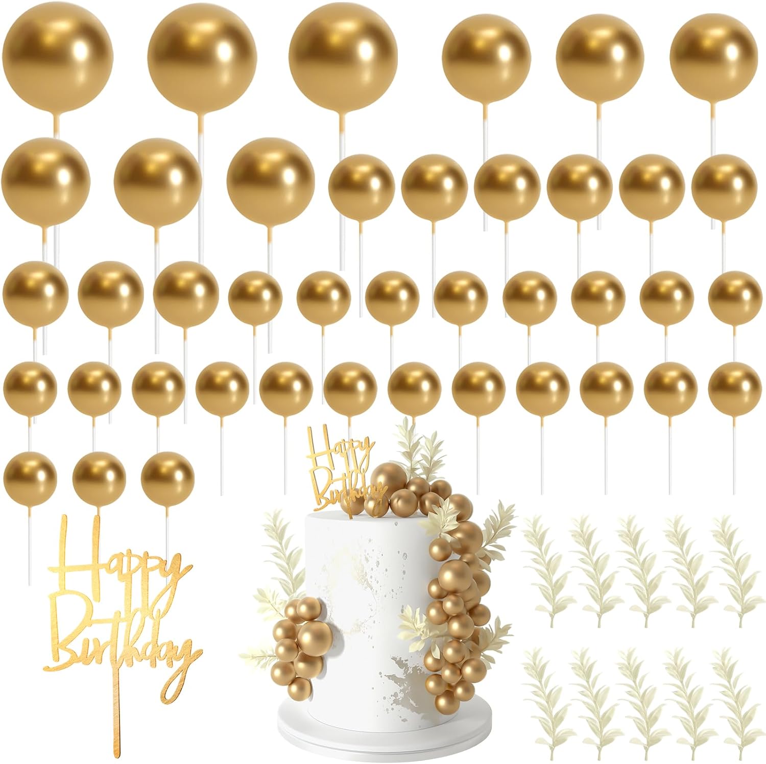 - Package included : 10pcs white grass cake toppers, 1pc happy birthday cake topper, 42pcs gold balls