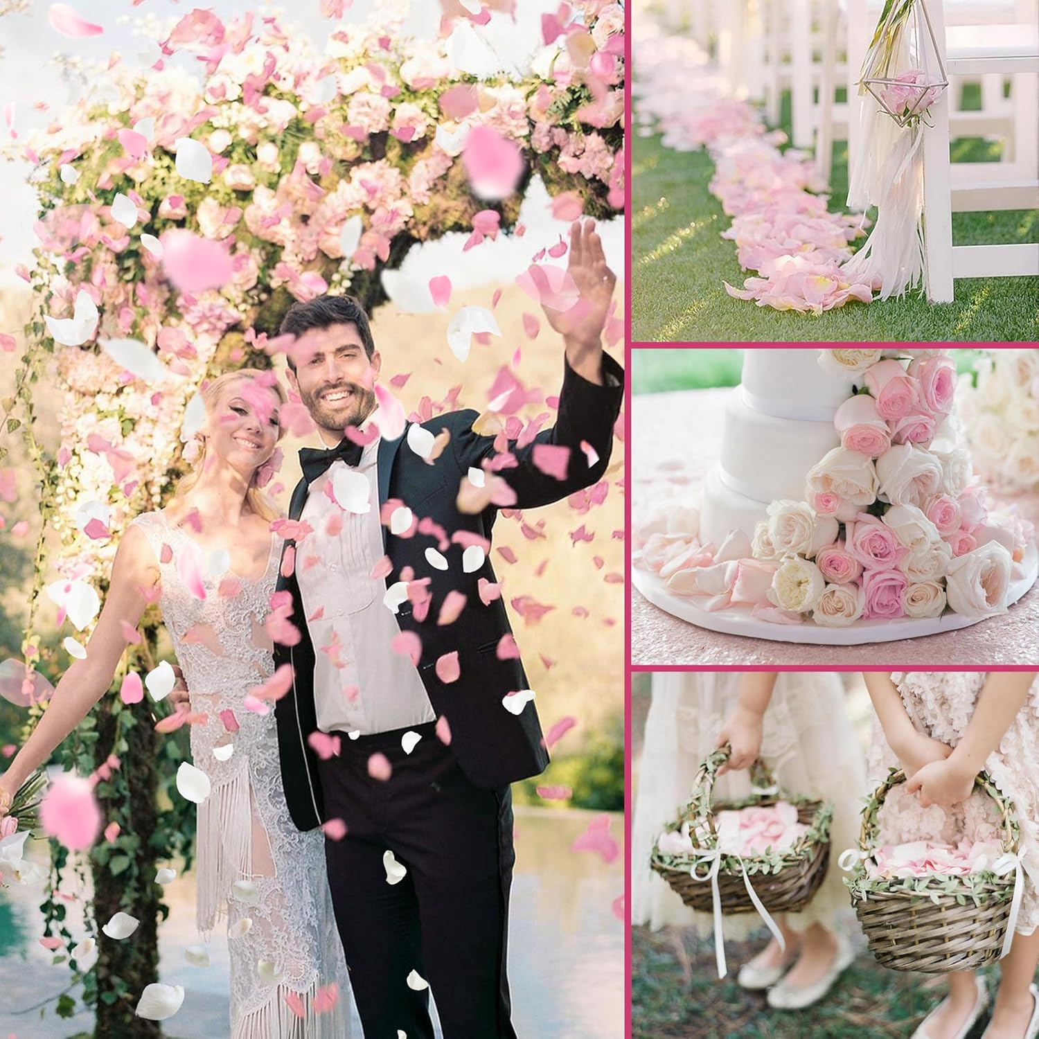 - 🌹【Rose petals for wedding】: a well-planned wedding can not be without rose petal decoration, these natural rose petals can be used in the arrangement of the wedding table, wedding venue decoration, accompanied by decorative gifts, flower girl basket throwing, pure white petals and elegant pink petals accompanied by guests throwing, with the blessing of the happy moments fixed